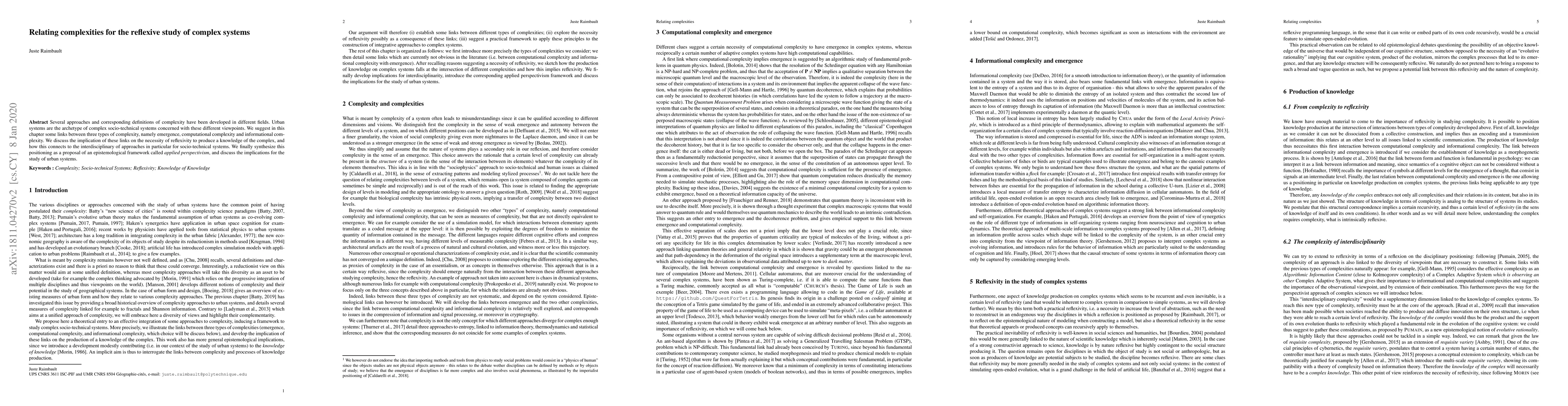 This paper explores connections between emergence, computational complexity, and informational complexity in the study of urban socio-technical systems, advocating for reflexivity in understanding complexity. It proposes an epistemological framework called applied perspectivism to guide interdisciplinary research on urban systems.