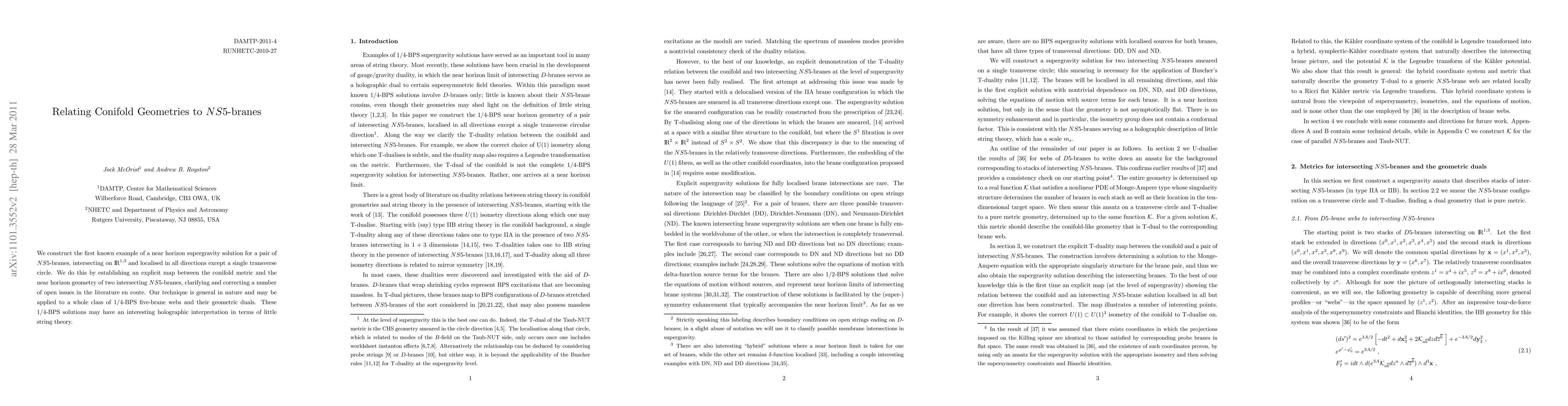 We construct the first known example of a near horizon supergravity solution for a pair of NS5-branes, intersecting on R^{1,3} and localised in all directions except a single transverse circle. We do this by establishing an explicit map between the conifold metric and the near horizon geometry of two intersecting NS5-branes, clarifying and correcting a number of open issues in the literature en route. Our technique is general in nature and may be applied to a whole class of 1/4-BPS five-brane webs and their geometric duals. These 1/4-BPS solutions may have an interesting holographic interpretation in terms of little string theory.