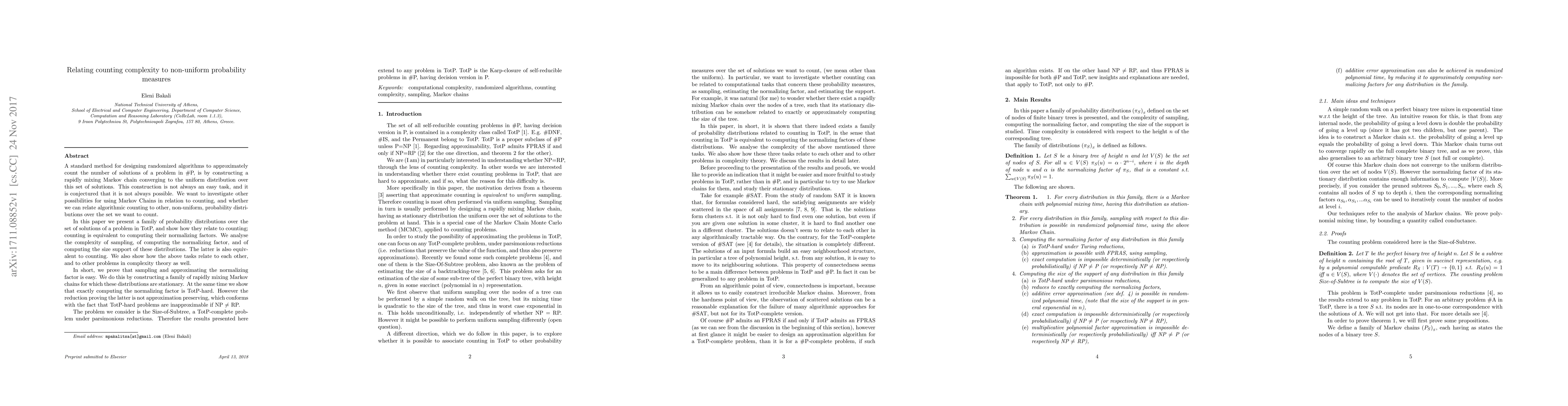 A standard method for designing randomized algorithms to approximately count the number of solutions of a problem in $\#$P, is by constructing a rapidly mixing Markov chain converging to the uniform distribution over this set of solutions. This construction is not always an easy task, and it is conjectured that it is not always possible. We want to investigate other possibilities for using Markov Chains in relation to counting, and whether we can relate algorithmic counting to other, non-uniform, probability distributions over the set we want to count. In this paper we present a family of probability distributions over the set of solutions of a problem in TotP, and show how they relate to counting; counting is equivalent to computing their normalizing factors. We analyse the complexity of sampling, of computing the normalizing factor, and of computing the size support of these distributions. The latter is also equivalent to counting. We also show how the above tasks relate to each other, and to other problems in complexity theory as well. In short, we prove that sampling and approximating the normalizing factor is easy. We do this by constructing a family of rapidly mixing Markov chains for which these distributions are stationary. At the same time we show that exactly computing the normalizing factor is TotP-hard. However the reduction proving the latter is not approximation preserving, which conforms with the fact that TotP-hard problems are inapproximable if NP $\neq$ RP. The problem we consider is the Size-of-Subtree, a TotP-complete problem under parsimonious reductions. Therefore the results presented here extend to any problem in TotP. TotP is the Karp-closure of self-reducible problems in $\#$P, having decision version in P.