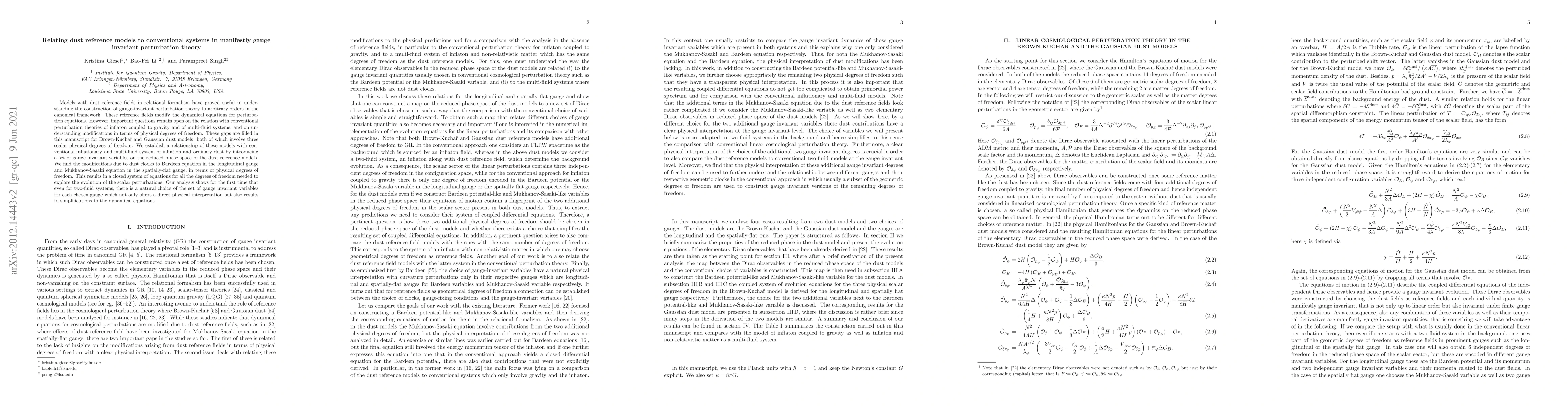 Models with dust reference fields in relational formalism have proved useful in understanding the construction of gauge-invariant perturbation theory to arbitrary orders in the canonical framework. These reference fields modify the dynamical equations for perturbation equations. However, important questions remain open on the relation with conventional perturbation theories of inflaton coupled to gravity and of multi-fluid systems, and on understanding modifications in terms of physical degrees of freedom. These gaps are filled in this manuscript for Brown-Kucha\v{r} and Gaussian dust models, both of which involve three scalar physical degrees of freedom. We establish a relationship of these models with conventional inflationary and multi-fluid system of inflation and ordinary dust by introducing a set of gauge invariant variables on the reduced phase space of the dust reference models. We find the modifications due to dust clocks to Bardeen equation in the longitudinal gauge and Mukhanov-Sasaki equation in the spatially-flat gauge, in terms of physical degrees of freedom. This results in a closed system of equations for all the degrees of freedom needed to explore the evolution of the scalar perturbations. Our analysis shows for the first time that even for two-fluid systems, there is a natural choice of the set of gauge invariant variables for each chosen gauge which not only offers a direct physical interpretation but also results in simplifications to the dynamical equations.