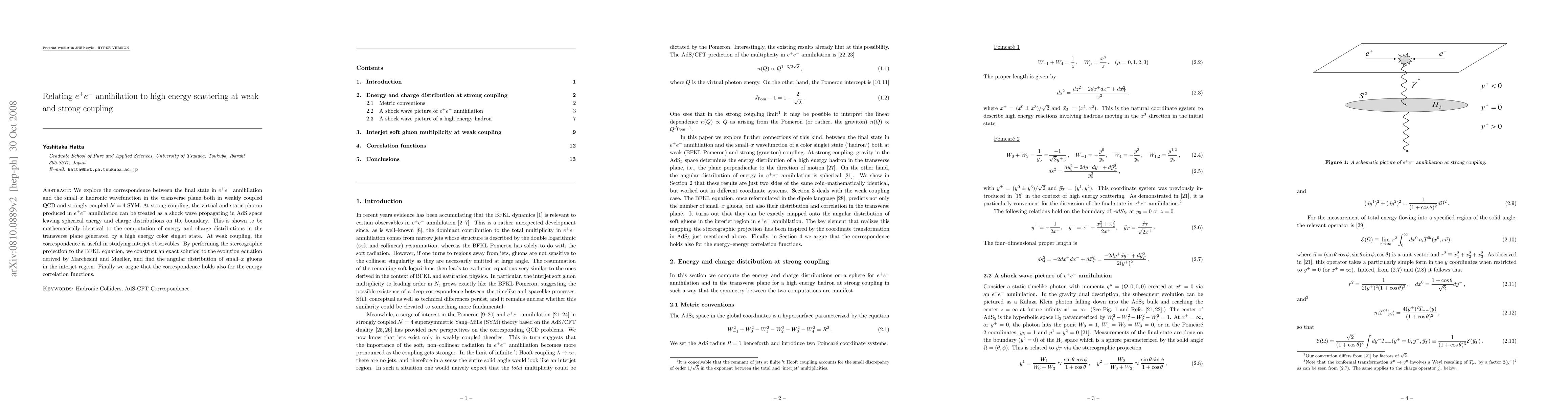 We explore the correspondence between the final state in e^+e^- annihilation and the small-x hadronic wavefunction in the transverse plane both in weakly coupled QCD and strongly coupled N=4 SYM. At strong coupling, the virtual and static photon produced in e^+e^- annihilation can be treated as a shock wave propagating in AdS space leaving spherical energy and charge distributions on the boundary. This is shown to be mathematically identical to the computation of energy and charge distributions in the transverse plane generated by a high energy color singlet state. At weak coupling, the correspondence is useful in studying interjet observables. By performing the stereographic projection to the BFKL equation, we construct an exact solution to the evolution equation derived by Marchesini and Mueller, and find the angular distribution of small-x gluons in the interjet region. Finally we argue that the correspondence holds also for the energy correlation functions.