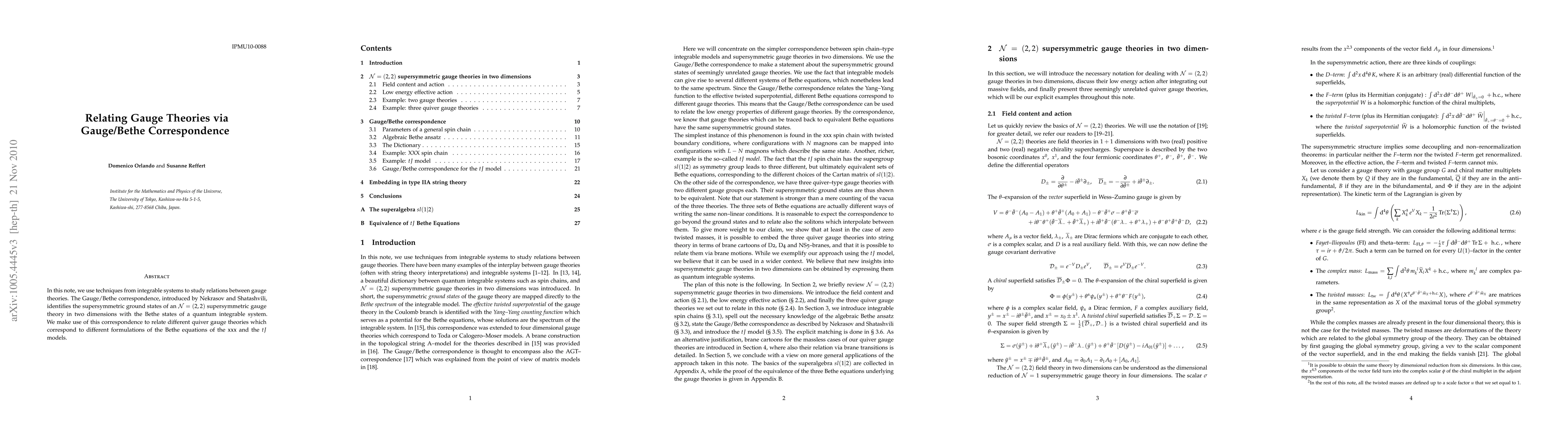 In this note, we use techniques from integrable systems to study relations between gauge theories. The Gauge/Bethe correspondence, introduced by Nekrasov and Shatashvili, identifies the supersymmetric ground states of an N=(2,2) supersymmetric gauge theory in two dimensions with the Bethe states of a quantum integrable system. We make use of this correspondence to relate three different quiver gauge theories which correspond to three different formulations of the Bethe equations of an integrable spin chain called the tJ model.