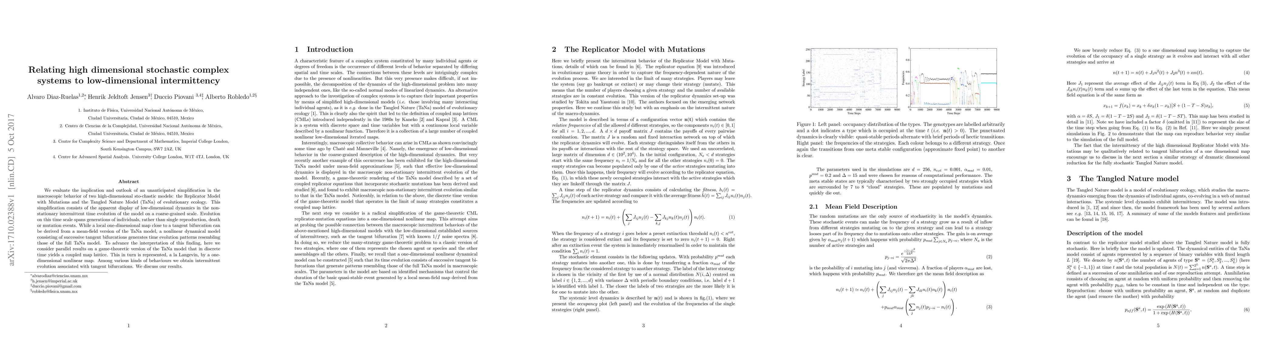 We evaluate the implication and outlook of an unanticipated simplification in the macroscopic behavior of two high-dimensional sto-chastic models: the Replicator Model with Mutations and the Tangled Nature Model (TaNa) of evolutionary ecology. This simplification consists of the apparent display of low-dimensional dynamics in the non-stationary intermittent time evolution of the model on a coarse-grained scale. Evolution on this time scale spans generations of individuals, rather than single reproduction, death or mutation events. While a local one-dimensional map close to a tangent bifurcation can be derived from a mean-field version of the TaNa model, a nonlinear dynamical model consisting of successive tangent bifurcations generates time evolution patterns resembling those of the full TaNa model. To advance the interpretation of this finding, here we consider parallel results on a game-theoretic version of the TaNa model that in discrete time yields a coupled map lattice. This in turn is represented, a la Langevin, by a one-dimensional nonlinear map. Among various kinds of behaviours we obtain intermittent evolution associated with tangent bifurcations. We discuss our results.