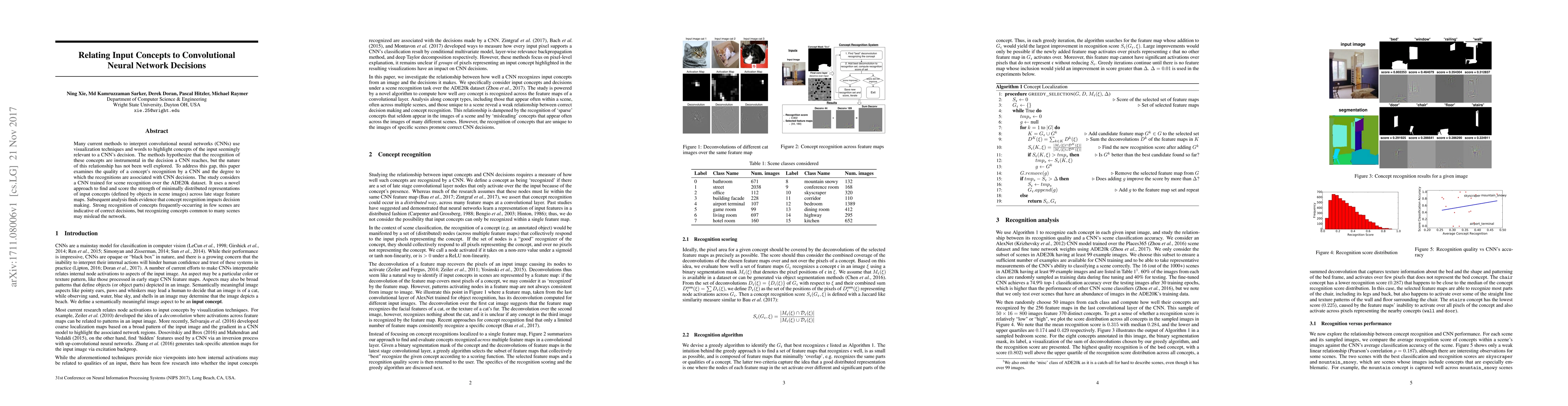 Many current methods to interpret convolutional neural networks (CNNs) use visualization techniques and words to highlight concepts of the input seemingly relevant to a CNN's decision. The methods hypothesize that the recognition of these concepts are instrumental in the decision a CNN reaches, but the nature of this relationship has not been well explored. To address this gap, this paper examines the quality of a concept's recognition by a CNN and the degree to which the recognitions are associated with CNN decisions. The study considers a CNN trained for scene recognition over the ADE20k dataset. It uses a novel approach to find and score the strength of minimally distributed representations of input concepts (defined by objects in scene images) across late stage feature maps. Subsequent analysis finds evidence that concept recognition impacts decision making. Strong recognition of concepts frequently-occurring in few scenes are indicative of correct decisions, but recognizing concepts common to many scenes may mislead the network.