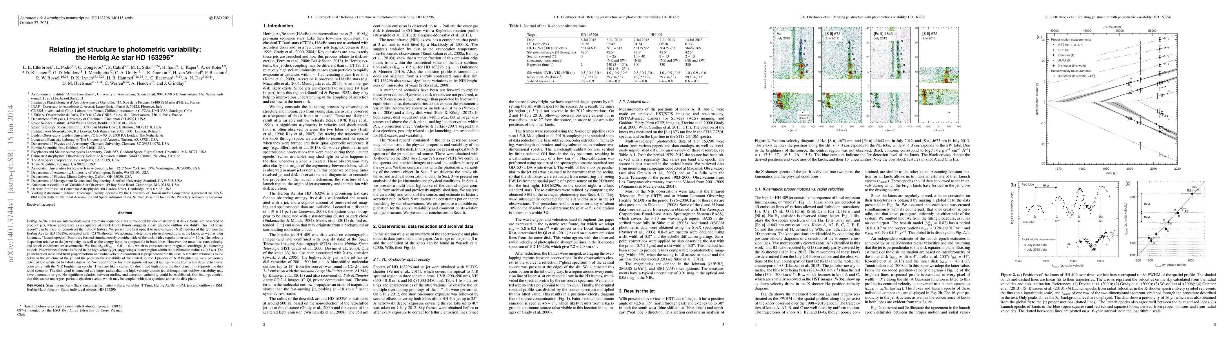 Herbig Ae/Be stars are intermediate-mass pre-main sequence stars surrounded by circumstellar dust disks. Some are observed to produce jets, whose appearance as a sequence of shock fronts (knots) suggests a past episodic outflow variability. This "jet fossil record" can be used to reconstruct the outflow history. We present the first optical to near-infrared (NIR) VLT/X-shooter spectra of the jet from the Herbig Ae star HD 163296. We determine physical conditions in the knots, as well as their kinematic "launch epochs". Knots are formed simultaneously on either side of the disk, with a regular interval of ~16 yr. The velocity dispersion versus jet velocity and the energy input are comparable in both lobes. However, the mass loss rate, velocity, and shock conditions are asymmetric. We find Mjet/Macc ~ 0.01-0.1, consistent with magneto-centrifugal jet launching models. No evidence for dust is found in the high-velocity jet, suggesting it is launched within the sublimation radius (<0.5 au). The jet inclination measured from proper motions and radial velocities confirms it is perpendicular to the disk. A tentative relation is found between the structure of the jet and the photometric variability of the source. Episodes of NIR brightening were previously detected and attributed to a dusty disk wind. We report for the first time significant optical fadings lasting from a few days up to a year, coinciding with the NIR brightenings. These are likely caused by dust lifted high above the disk plane; this supports the disk wind scenario. The disk wind is launched at a larger radius than the high-velocity atomic jet, although their outflow variability may have a common origin. No significant relation between outflow and accretion variability could be established. Our findings confirm that this source undergoes periodic ejection events, which may be coupled with dust ejections above the disk plane.