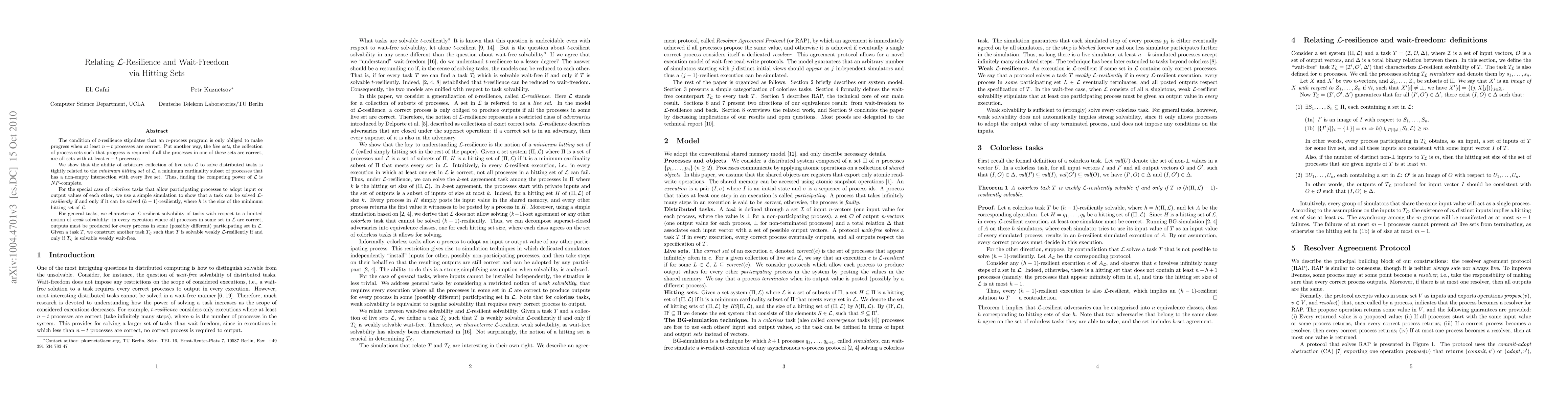 The condition of t-resilience stipulates that an n-process program is only obliged to make progress when at least n-t processes are correct. Put another way, the live sets, the collection of process sets such that progress is required if all the processes in one of these sets are correct, are all sets with at least n-t processes. We show that the ability of arbitrary collection of live sets L to solve distributed tasks is tightly related to the minimum hitting set of L, a minimum cardinality subset of processes that has a non-empty intersection with every live set. Thus, finding the computing power of L is NP-complete. For the special case of colorless tasks that allow participating processes to adopt input or output values of each other, we use a simple simulation to show that a task can be solved L-resiliently if and only if it can be solved (h-1)-resiliently, where h is the size of the minimum hitting set of L. For general tasks, we characterize L-resilient solvability of tasks with respect to a limited notion of weak solvability: in every execution where all processes in some set in L are correct, outputs must be produced for every process in some (possibly different) participating set in L. Given a task T, we construct another task T_L such that T is solvable weakly L-resiliently if and only if T_L is solvable weakly wait-free.