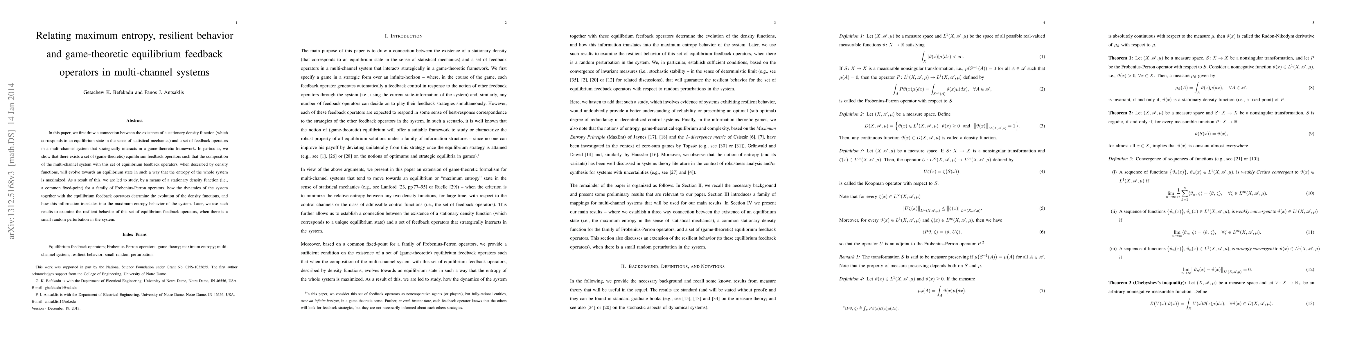 In this paper, we first draw a connection between the existence of a stationary density function (which corresponds to an equilibrium state in the sense of statistical mechanics) and a set of feedback operators in a multi-channel system that strategically interacts in a game-theoretic framework. In particular, we show that there exists a set of (game-theoretic) equilibrium feedback operators such that the composition of the multi-channel system with this set of equilibrium feedback operators, when described by density functions, will evolve towards an equilibrium state in such a way that the entropy of the whole system is maximized. As a result of this, we are led to study, by a means of a stationary density function (i.e., a common fixed-point) for a family of Frobenius-Perron operators, how the dynamics of the system together with the equilibrium feedback operators determine the evolution of the density functions, and how this information translates into the maximum entropy behavior of the system. Later, we use such results to examine the resilient behavior of this set of equilibrium feedback operators, when there is a small random perturbation in the system.
