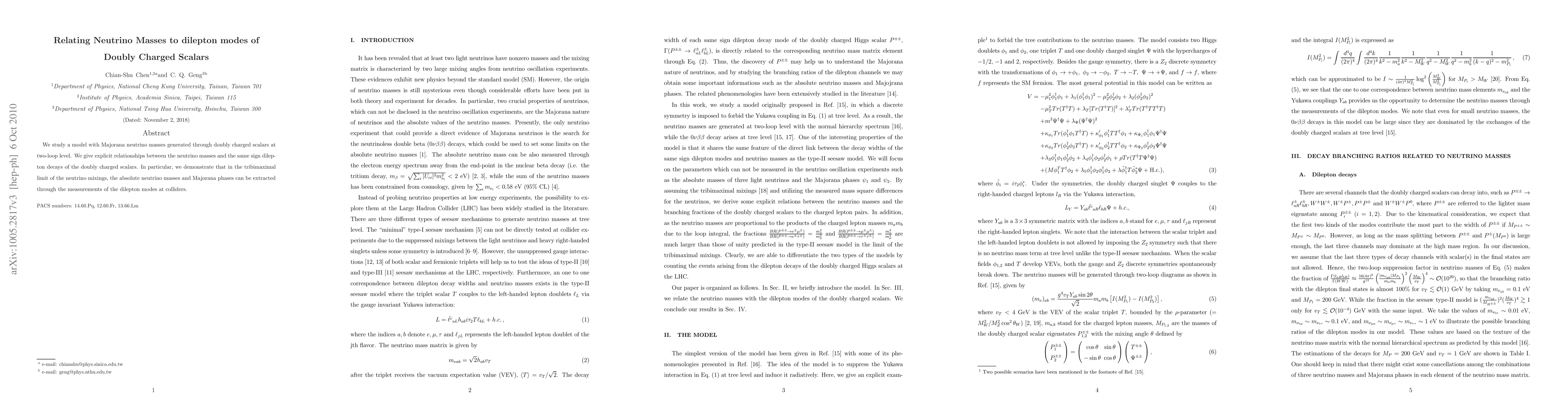 We study a model with Majorana neutrino masses generated through doubly charged scalars at two-loop level. We give explicit relationships between the neutrino masses and the same sign dilepton decays of the doubly charged scalars. In particular, we demonstrate that at the tribimaximal limit of the neutrino mixings, the absolute neutrino masses and Majorana phases can be extracted through the measurements of the dilepton modes at colliders.