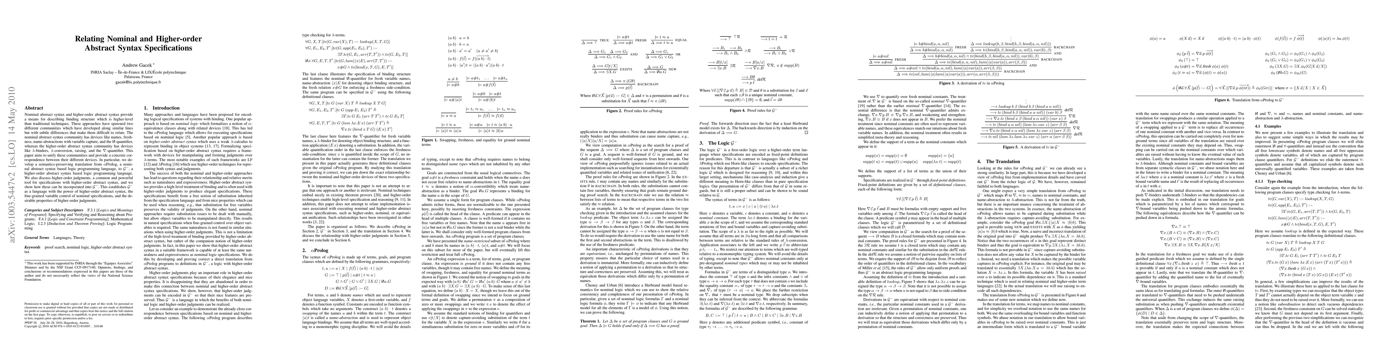 This paper establishes a correspondence between nominal and higher-order abstract syntax, translating alpha-Prolog (nominal) to G- (higher-order), and incorporates higher-order judgments into G-, merging the strengths of both approaches.