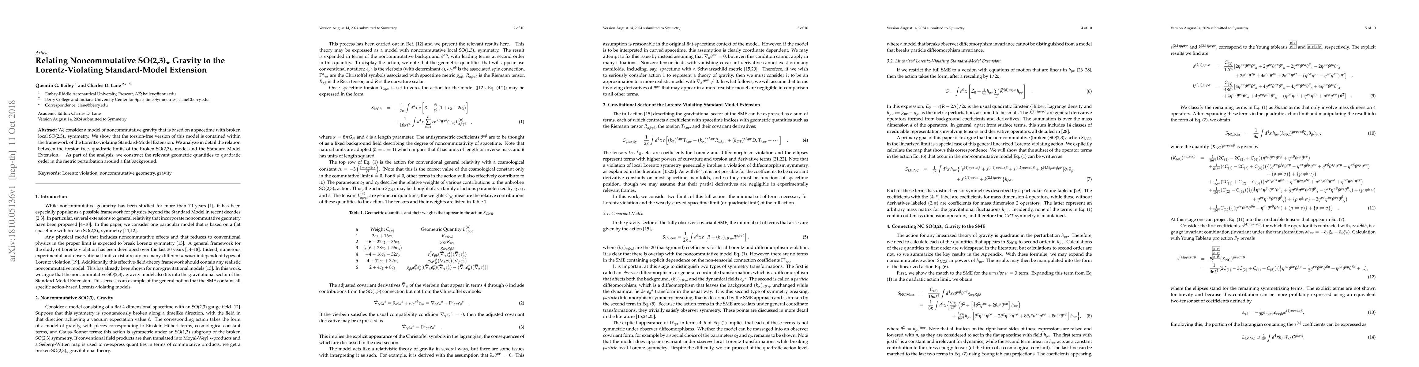 We consider a model of noncommutative gravity that is based on a spacetime with broken local SO(2,3) symmetry. We show that the torsion-free version of this model is contained within the framework of the Lorentz-violating Standard-Model Extension. We analyze in detail the relation between the torsion-free, quadratic limits of the broken SO(2,3) model and the Standard-Model Extension. As part of the analysis,we construct the relevant geometric quantities to quadratic order in the metric perturbation around a flat background.