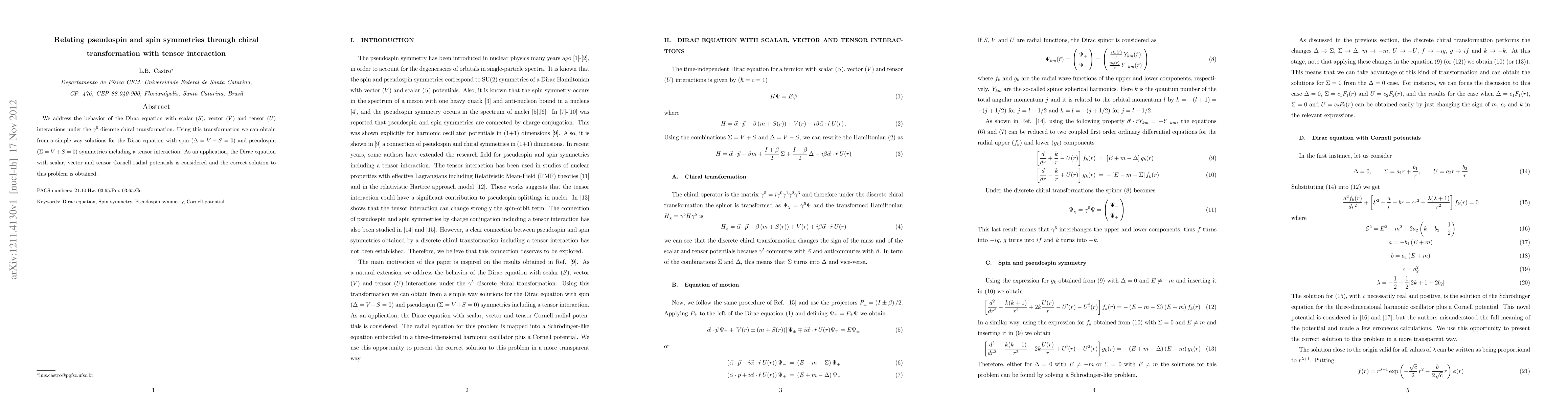 This paper explores the relationship between spin and pseudospin symmetries in the Dirac equation through a chiral transformation, demonstrating how tensor interactions can be incorporated. It successfully applies this method to solve the Dirac equation under Cornell radial potentials.