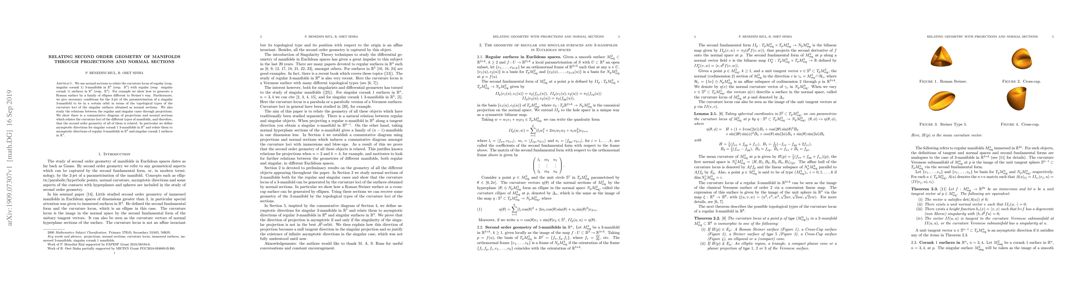 We use normal sections to relate the curvature locus of regular (resp. singular corank 1) 3-manifolds in $\mathbb{R}^6$ (resp. $\mathbb R^5$) with regular (resp. singular corank 1) surfaces in $\mathbb R^5$ (resp. $\mathbb R^4$). For example we show how to generate a Roman surface by a family of ellipses different to Steiner's way. Furthermore, we give necessary conditions for the 2-jet of the parametrisation of a singular 3-manifold to be in a certain orbit in terms of the topological types of the curvature loci of the singular surfaces obtained as normal sections. We also study the relations between the regular and singular cases through projections. We show there is a commutative diagram of projections and normal sections which relates the curvature loci of the different types of manifolds, and therefore, that the second order geometry of all of them is related. In particular we define asymptotic directions for singular corank 1 3-manifolds in $\mathbb R^5$ and relate them to asymptotic directions of regular 3-manifolds in $\mathbb R^6$ and singular corank 1 surfaces in $\mathbb R^4$.