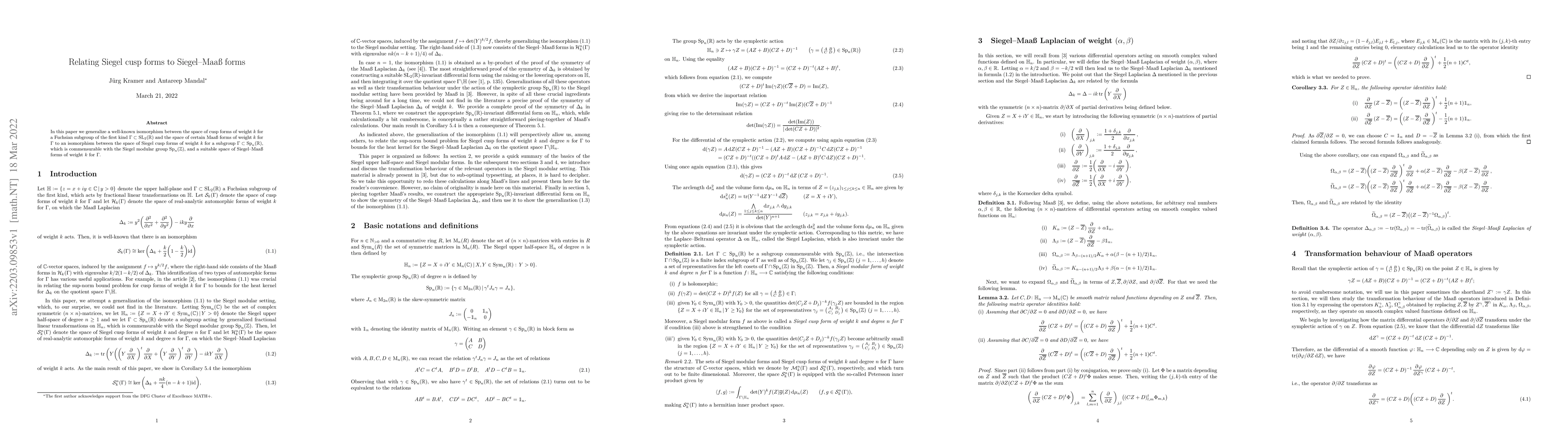 This paper establishes an isomorphism between the space of Siegel cusp forms of weight $k$ for a commensurable subgroup of the Siegel modular group and a corresponding space of Siegel-Maa{\ss} forms of weight $k$. It generalizes the known isomorphism between cusp forms and Maa{\ss} forms to higher dimensions.