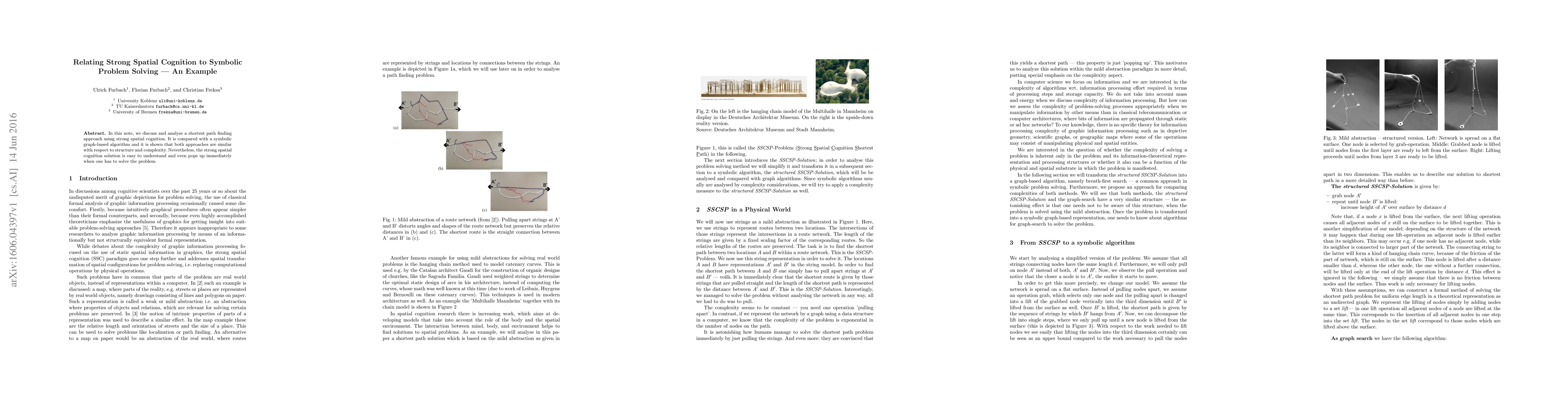 In this note, we discuss and analyse a shortest path finding approach using strong spatial cognition. It is compared with a symbolic graph-based algorithm and it is shown that both approaches are similar with respect to structure and complexity. Nevertheless, the strong spatial cognition solution is easy to understand and even pops up immediately when one has to solve the problem.