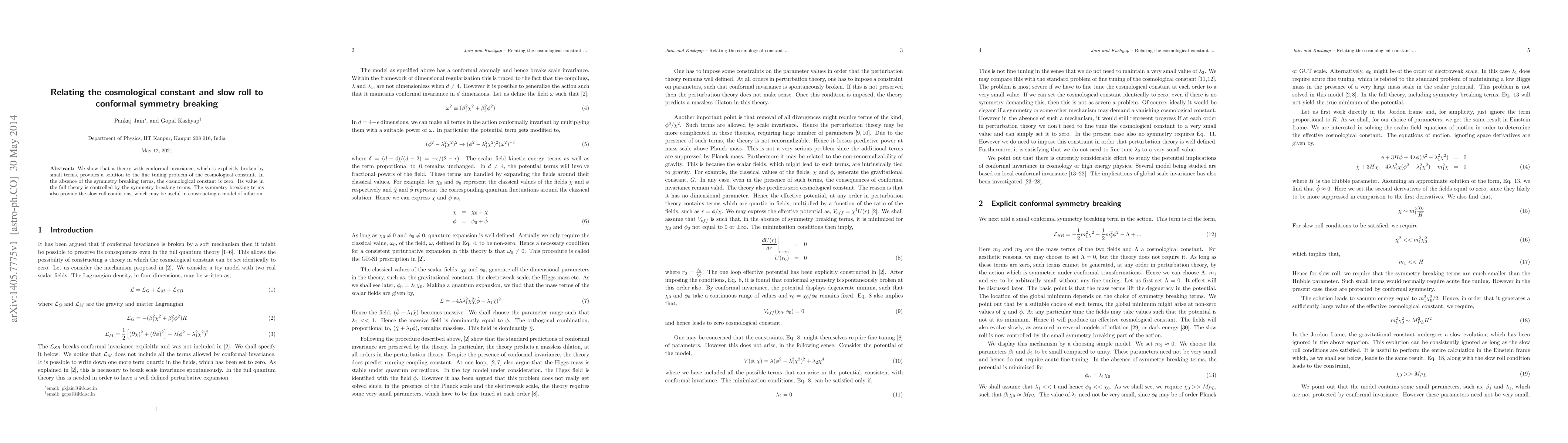 This paper explores how a theory with conformal invariance, when explicitly broken by small terms, can solve the cosmological constant fine-tuning problem, with the symmetry breaking terms controlling its value and providing conditions for slow roll, potentially aiding in inflation models.