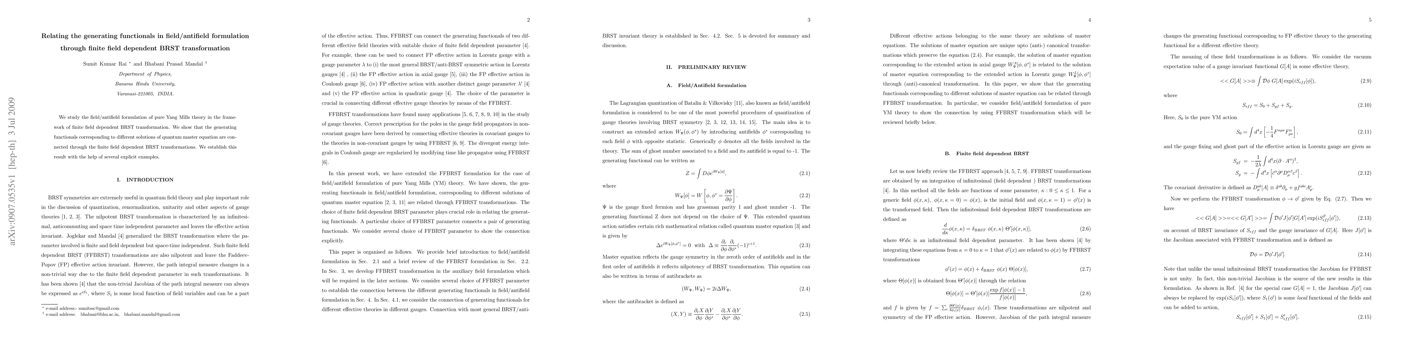 This paper explores the field/antifield formulation of pure Yang-Mills theory using finite field dependent BRST transformations, demonstrating a connection between generating functionals via these transformations and verifying the result with explicit examples.