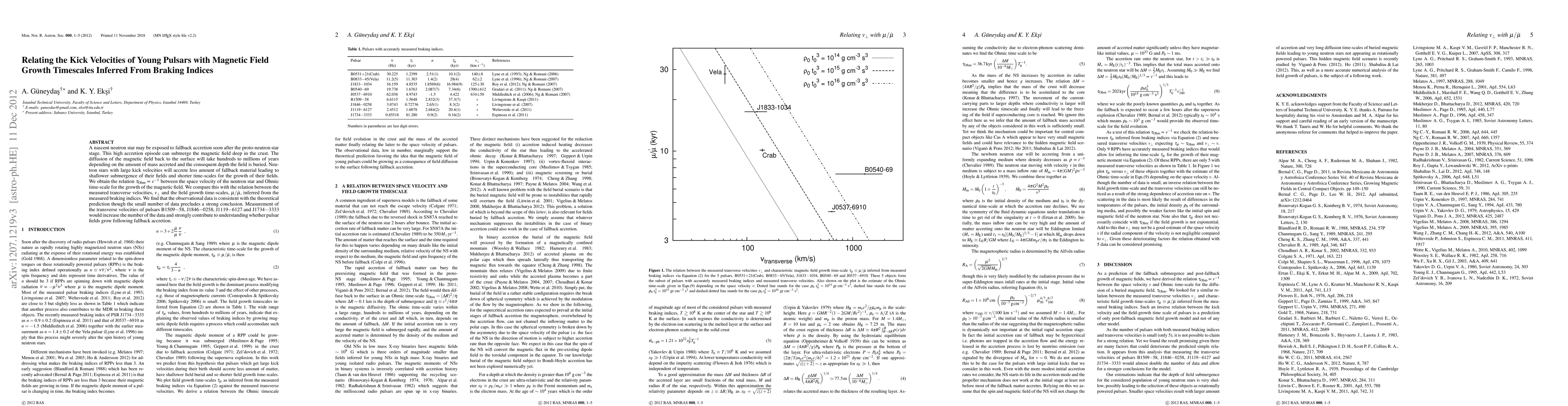 A nascent neutron star may be exposed to fallback accretion soon after the proto-neutron star stage. This high accretion episode can submerge the magnetic field deep in the crust. The diffusion of the magnetic field back to the surface will take hundreds to millions of years depending on the amount of mass accreted and the consequent depth the field is buried. Neutron stars with large kick velocities will accrete less amount of fallback material leading to shallower submergence of their fields and shorter time-scales for the growth of their fields. We obtain the relation $\tau_{\rm Ohm} \propto v^{-1}$ between the space velocity of the neutron star and Ohmic time-scale for the growth of the magnetic field. We compare this with the relation between the measured transverse velocities, $v_{\perp}$ and the field growth time-scales, $\mu/\dot{\mu}$, inferred from the measured braking indices. We find that the observational data is consistent with the theoretical prediction though the small number of data precludes a strong conclusion. Measurement of the transverse velocities of pulsars B1509$-$58, J1846$-$0258, J1119$-$6127 and J1734$-$3333 would increase the number of the data and strongly contribute to understanding whether pulsar fields grow following fallback accretion.