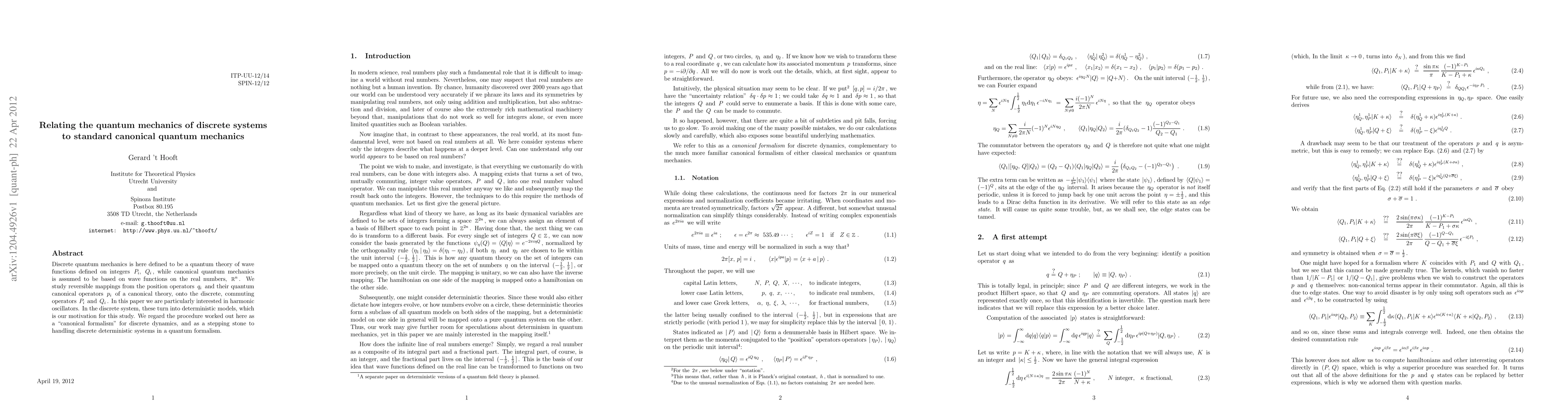 Discrete quantum mechanics is here defined to be a quantum theory of wave functions defined on integers P_i and Q_i, while canonical quantum mechanics is assumed to be based on wave functions on the real numbers, R^n. We study reversible mappings from the position operators q_i and their quantum canonical operators p_i of a canonical theory, onto the discrete, commuting operators Q_i and P_i. In this paper we are particularly interested in harmonic oscillators. In the discrete system, these turn into deterministic models, which is our motivation for this study. We regard the procedure worked out here as a "canonical formalism" for discrete dynamics, and as a stepping stone to handling discrete deterministic systems in a quantum formalism.