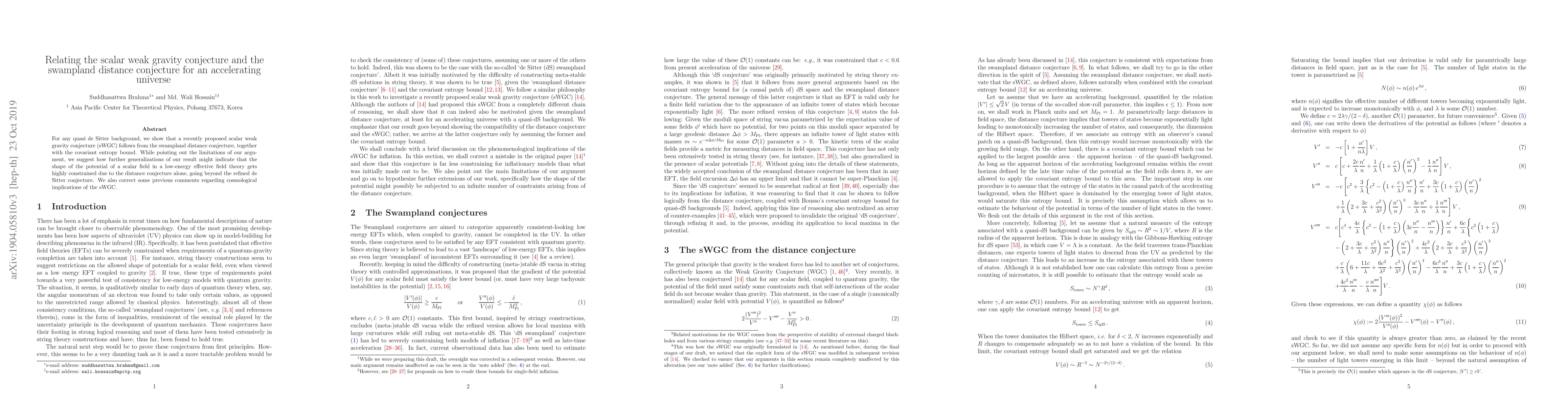 This paper demonstrates that the scalar weak gravity conjecture (sWGC) for quasi de Sitter backgrounds can be derived from the swampland distance conjecture and the covariant entropy bound. It also discusses the potential implications for the shape of scalar field potentials in low-energy effective field theories and corrects earlier interpretations of the sWGC's cosmological effects.