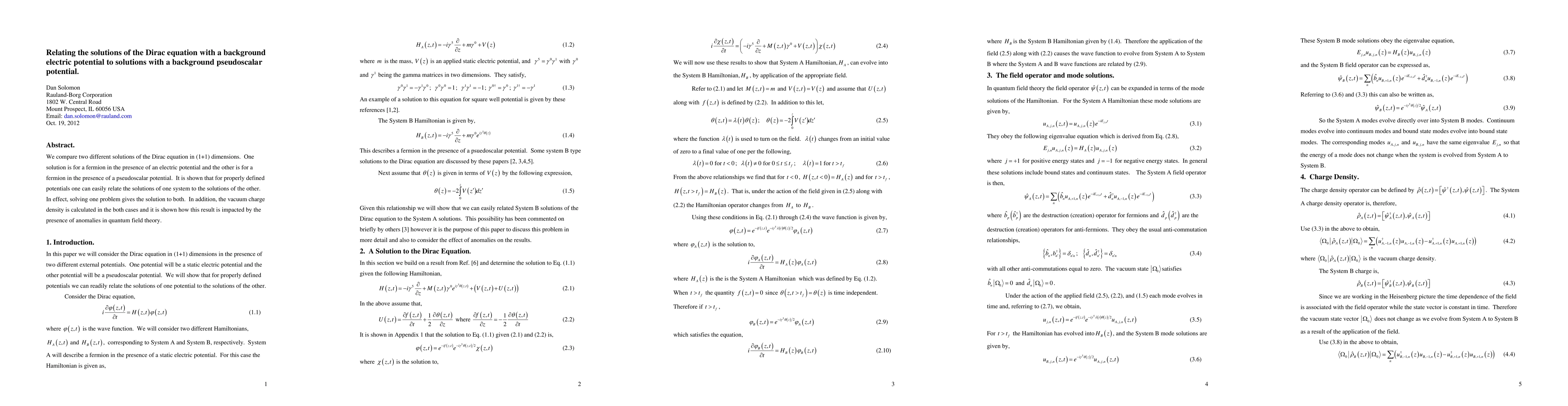 We compare two different solutions of the Dirac equation in (1+1) dimensions. One solution is for a fermion in the presence of an electric potential and the other is for a fermion in the presence of a pseudoscalar potential. It is shown that for properly defined potentials one can easily relate the solutions of one system to the solutions of the other. In effect, solving one problem gives the solution to both. In addition, the vacuum charge density is calculated in the both cases and it is shown how this result is impacted by the presence of anomalies in quantum field theory.