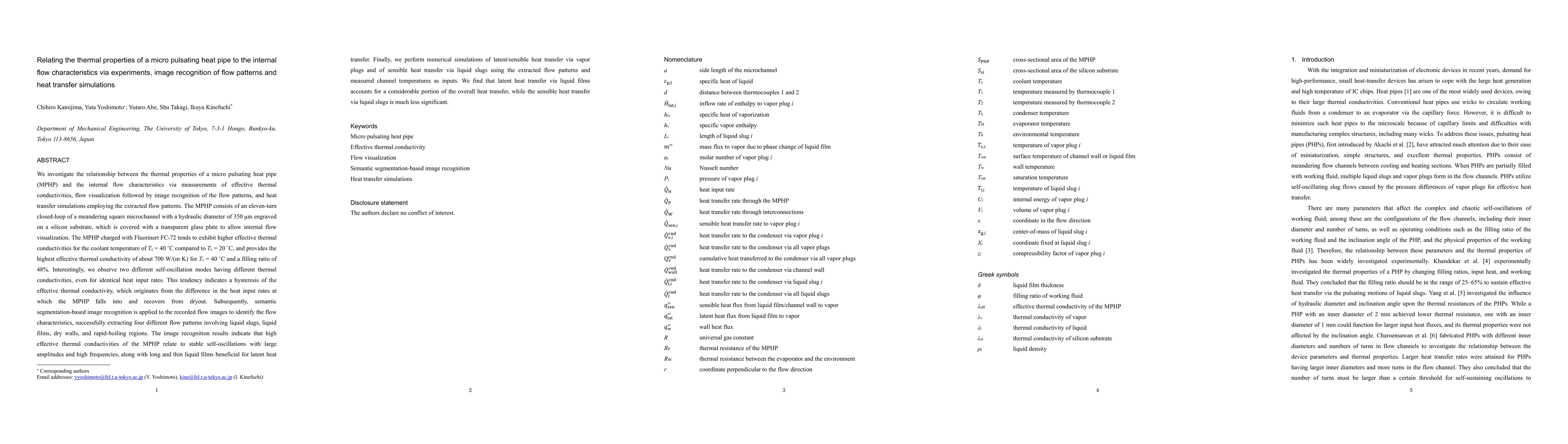 This study explores the thermal properties of a micro pulsating heat pipe (MPHP) and its internal flow characteristics through experiments, image recognition, and simulations. The MPHP exhibits higher thermal conductivity at higher coolant temperatures, with a peak of 700 W/(m·K) at 40°C. Two self-oscillation modes are identified, indicating hysteresis in thermal conductivity. Image recognition reveals four flow patterns, with high thermal conductivity correlating to stable oscillations with large amplitudes and thin liquid films enhancing latent heat transfer.