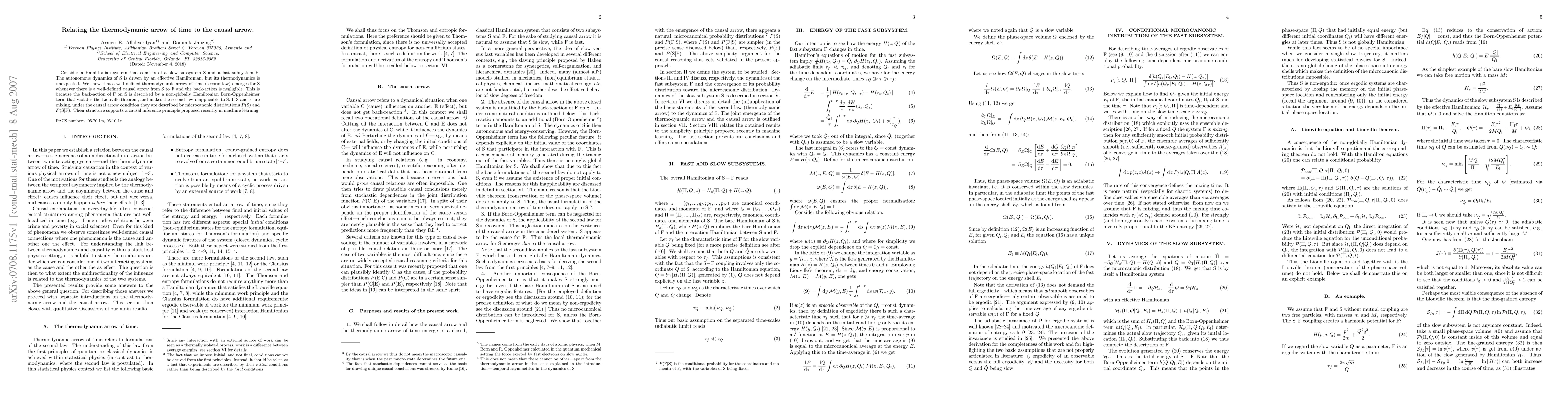 Consider a Hamiltonian system that consists of a slow subsystem S and a fast subsystem F. The autonomous dynamics of S is driven by an effective Hamiltonian, but its thermodynamics is unexpected. We show that a well-defined thermodynamic arrow of time (second law) emerges for S whenever there is a well-defined causal arrow from S to F and the back-action is negligible. This is because the back-action of F on S is described by a non-globally Hamiltonian Born-Oppenheimer term that violates the Liouville theorem, and makes the second law inapplicable to S. If S and F are mixing, under the causal arrow condition they are described by microcanonic distributions P(S) and P(S|F). Their structure supports a causal inference principle proposed recently in machine learning.