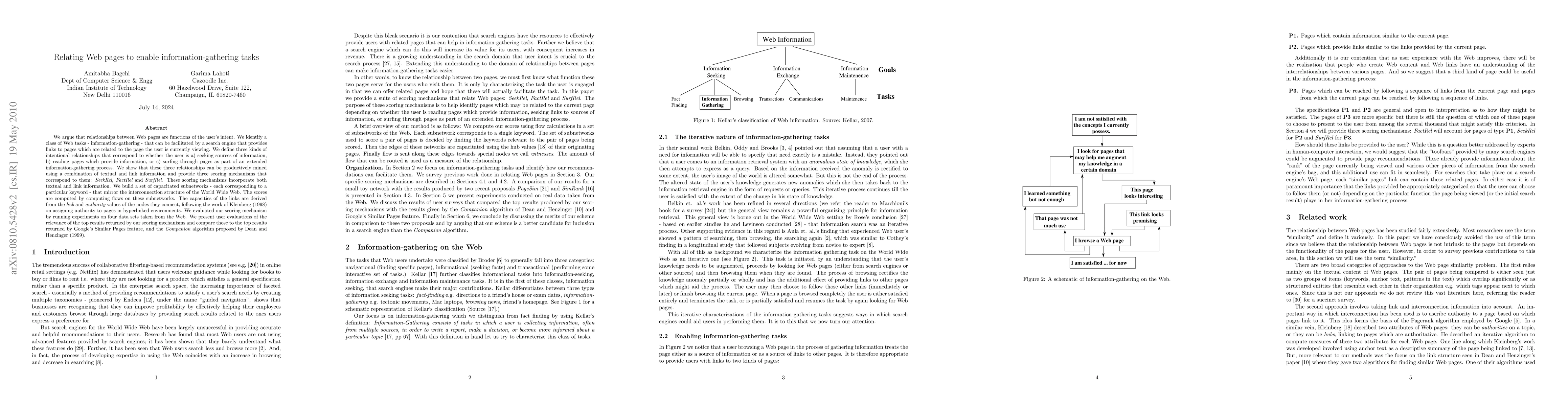 We argue that relationships between Web pages are functions of the user's intent. We identify a class of Web tasks - information-gathering - that can be facilitated by a search engine that provides links to pages which are related to the page the user is currently viewing. We define three kinds of intentional relationships that correspond to whether the user is a) seeking sources of information, b) reading pages which provide information, or c) surfing through pages as part of an extended information-gathering process. We show that these three relationships can be productively mined using a combination of textual and link information and provide three scoring mechanisms that correspond to them: {\em SeekRel}, {\em FactRel} and {\em SurfRel}. These scoring mechanisms incorporate both textual and link information. We build a set of capacitated subnetworks - each corresponding to a particular keyword - that mirror the interconnection structure of the World Wide Web. The scores are computed by computing flows on these subnetworks. The capacities of the links are derived from the {\em hub} and {\em authority} values of the nodes they connect, following the work of Kleinberg (1998) on assigning authority to pages in hyperlinked environments. We evaluated our scoring mechanism by running experiments on four data sets taken from the Web. We present user evaluations of the relevance of the top results returned by our scoring mechanisms and compare those to the top results returned by Google's Similar Pages feature, and the {\em Companion} algorithm proposed by Dean and Henzinger (1999).