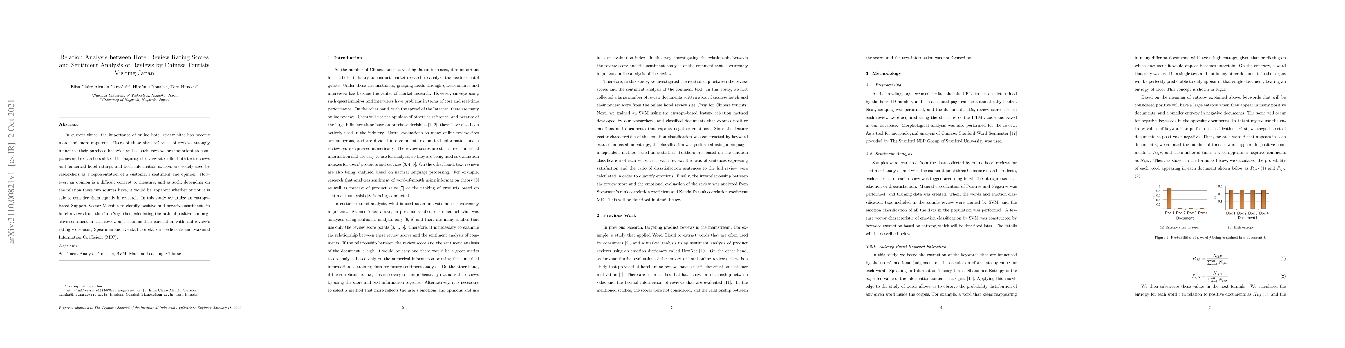 This study investigates the relationship between numerical hotel rating scores and sentiment analysis of reviews from Chinese tourists visiting Japan on the Ctrip site. It employs an entropy-based Support Vector Machine to classify review sentiments and uses correlation coefficients to examine the connection between sentiment and rating scores.
