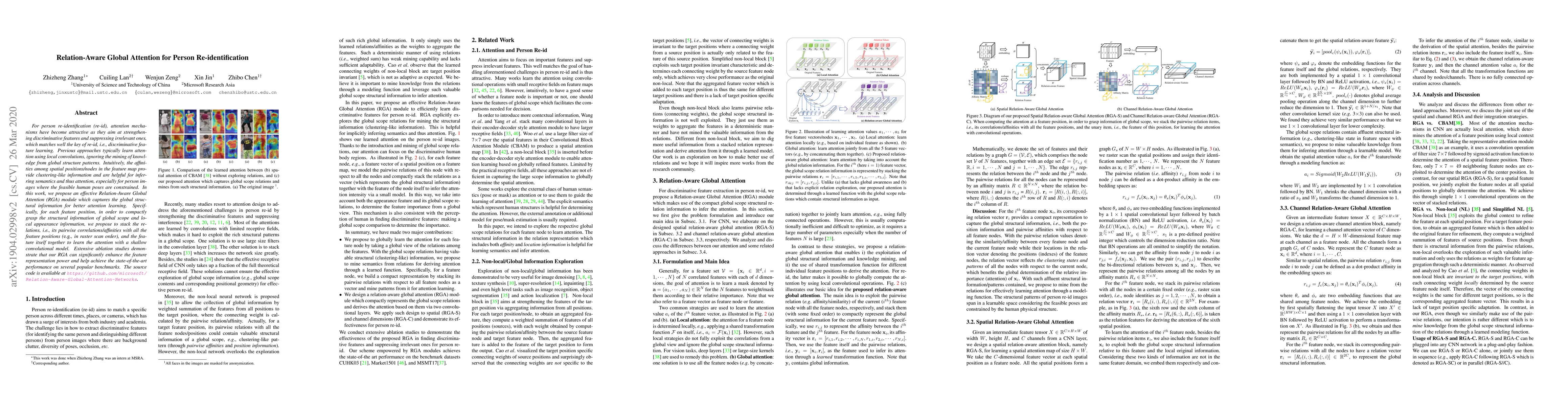 This paper introduces a Relation-Aware Global Attention (RGA) module for person re-identification, which captures global structural information to enhance discriminative feature learning. The proposed module stacks pairwise relations among feature positions with local appearance information to improve attention learning, achieving state-of-the-art performance on several benchmarks.