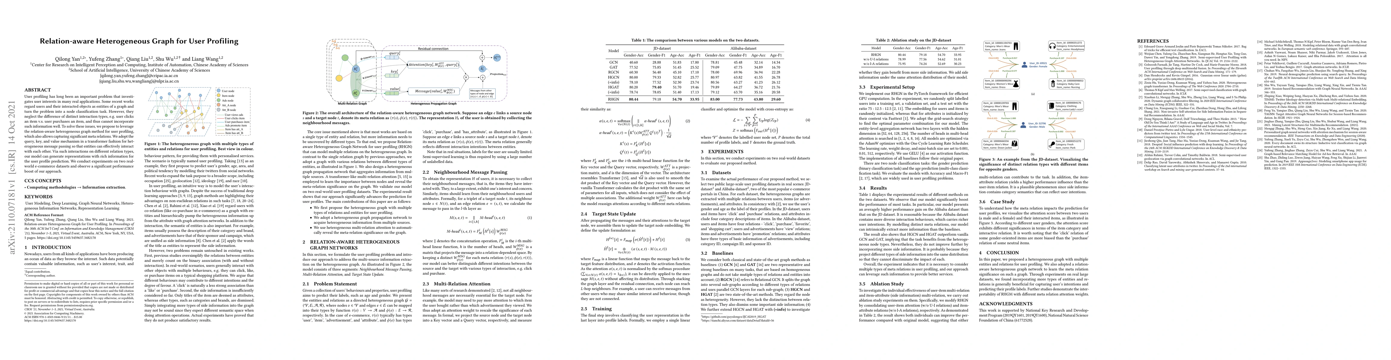 This paper proposes a relation-aware heterogeneous graph method for user profiling that captures distinct interaction types and meta relations. The model uses a transformer-based approach for message passing to generate rich user profile representations, achieving significant performance improvements on e-commerce datasets.