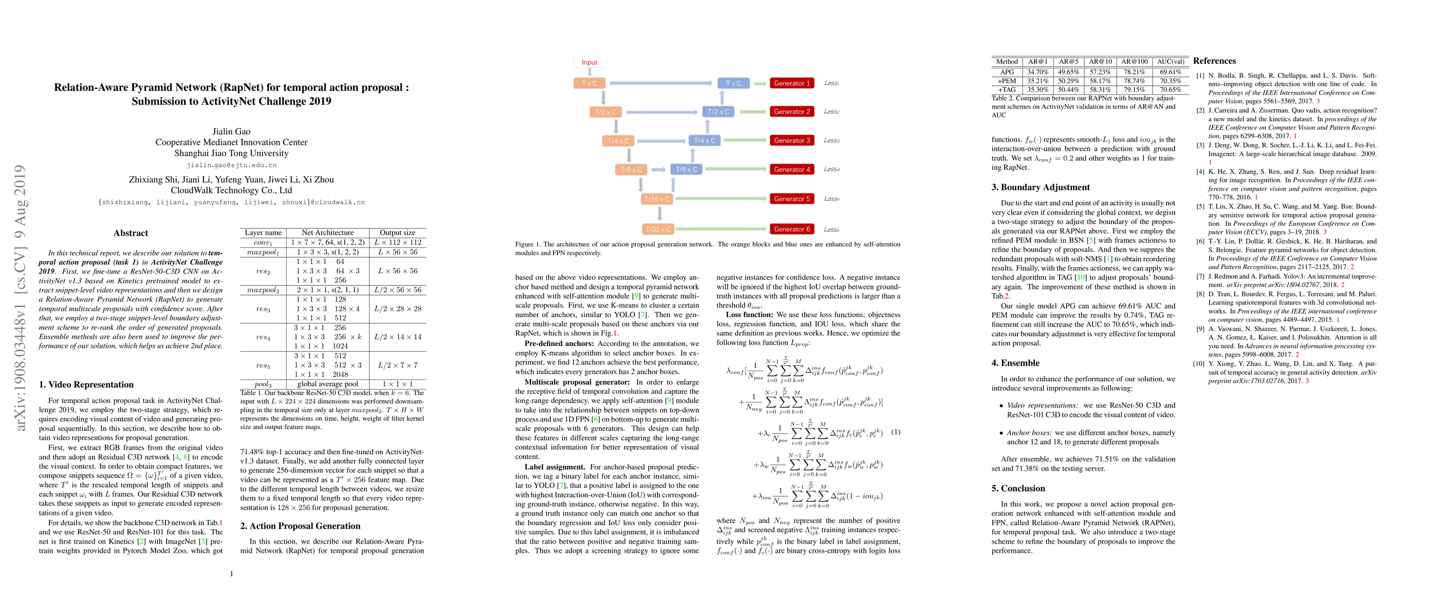 The paper presents a Relation-Aware Pyramid Network (RapNet) for generating temporal action proposals in the ActivityNet Challenge 2019. It fine-tunes a ResNet-50-C3D CNN for snippet-level video representations and employs a two-stage snippet-level boundary adjustment scheme, achieving 2nd place with ensemble methods.