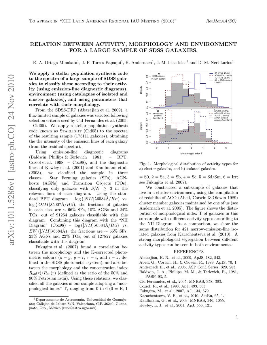 We apply a stellar population synthesis code to the spectra of a large sample of SDSS galaxies to classify these according to their activity (using emission-line diagnostic diagrams), environment (using catalogues of isolated and cluster galaxies), and using parameters that correlate with their morphology.