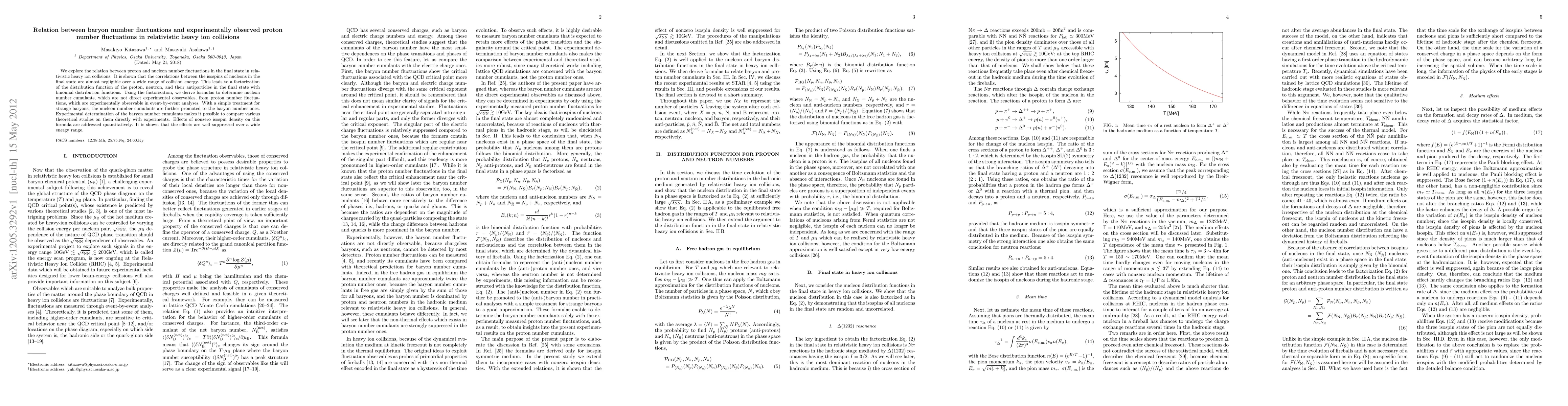 This paper investigates the connection between baryon number fluctuations and experimentally observed proton number fluctuations in relativistic heavy ion collisions, demonstrating that nucleon isospin correlations are negligible, leading to a factorization of distribution functions. It derives formulas to determine baryon number cumulants from proton number fluctuations, facilitating direct comparison with experimental data.