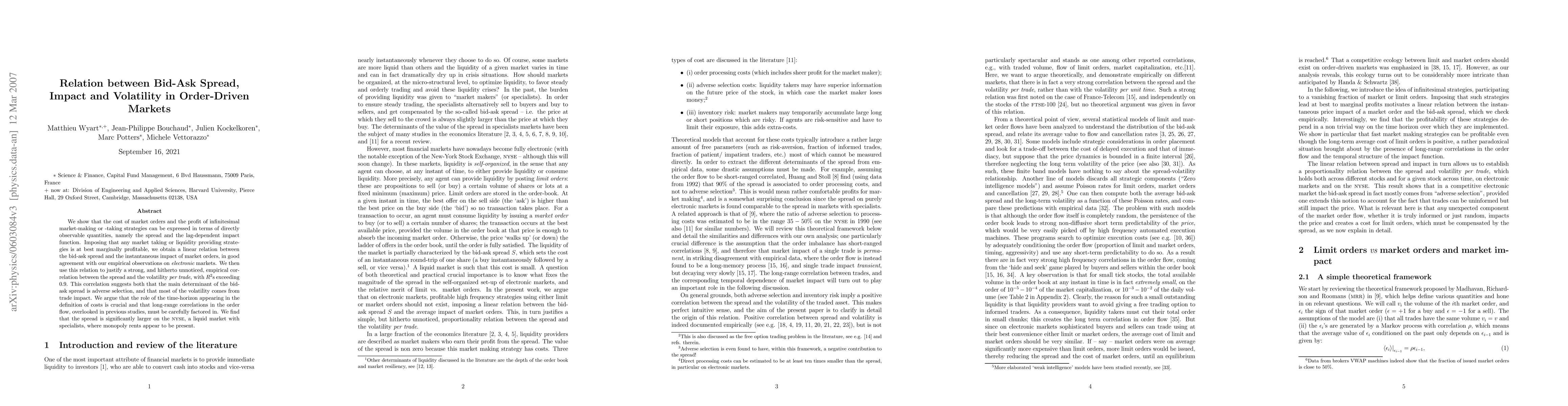 This paper establishes a linear relationship between bid-ask spread and market order impact in double auction markets, revealing a strong correlation between spread and trade volatility. It argues that adverse selection and trade impact are primary drivers of volatility, emphasizing the importance of long-range order flow correlations and the presence of monopoly rents in liquid markets.