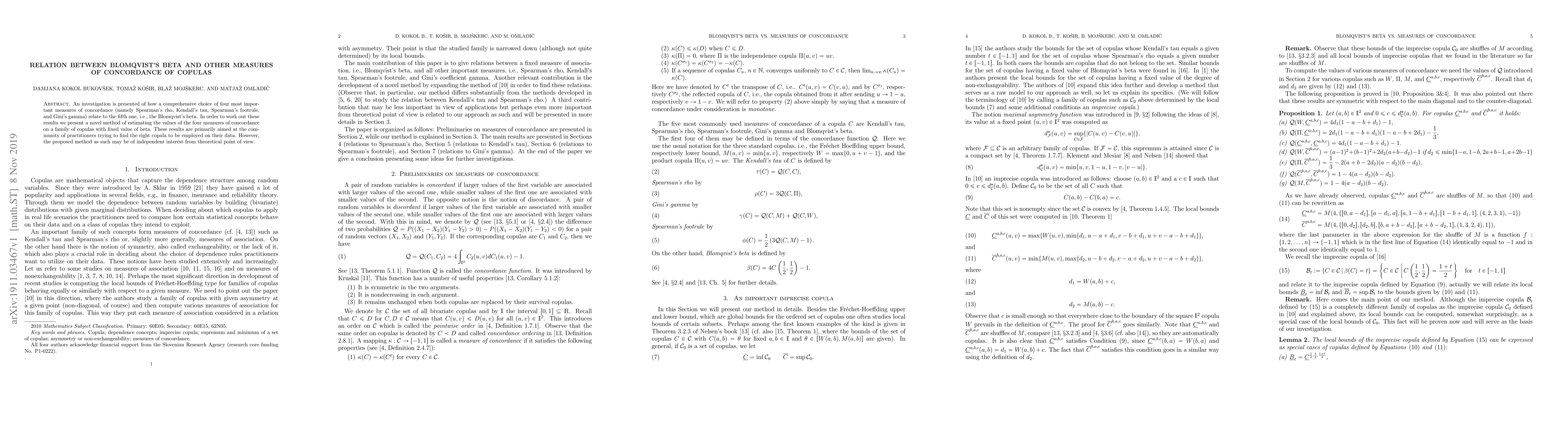 This study investigates how different measures of concordance between copulas relate to Blomqvist's beta, a key measure in copula selection for data analysis. The results provide insight into selecting the right copula for practical applications.