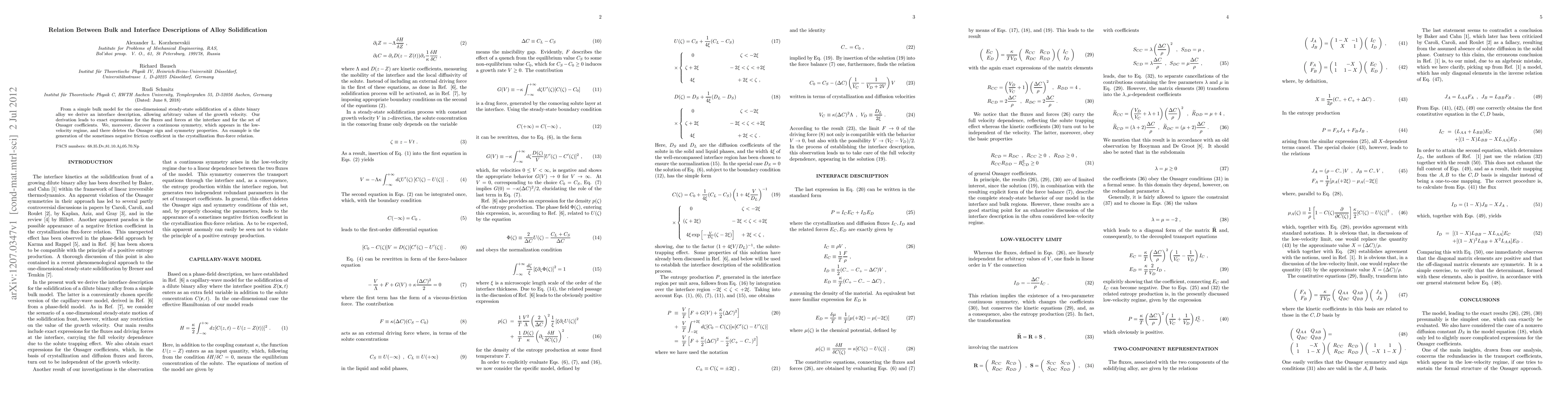 The paper presents a detailed derivation of an interface description from a bulk model for alloy solidification, leading to exact expressions for fluxes, forces, and Onsager coefficients, and uncovering a continuous symmetry in the low-velocity regime.