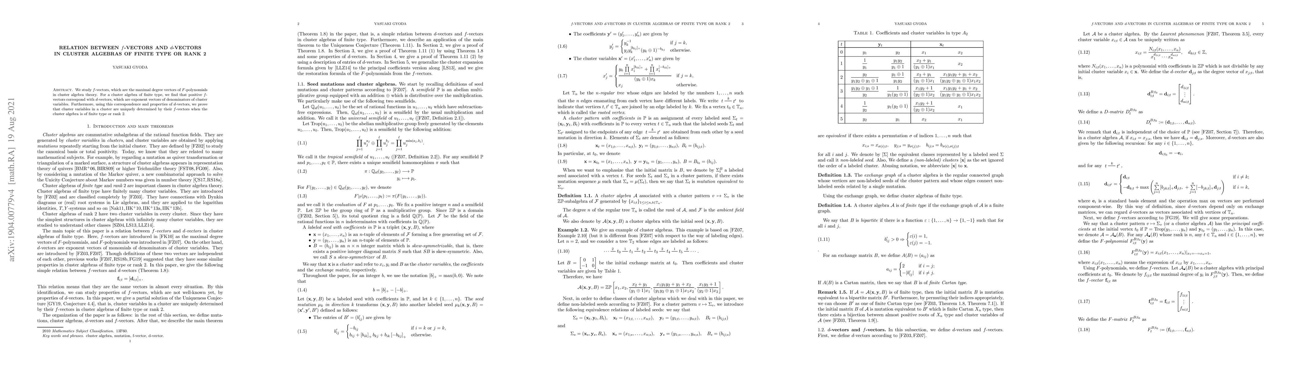 We study $f$-vectors, which are the maximal degree vectors of $F$-polynomials in cluster algebra theory. For a cluster algebra is of finite type, we find that positive $f$-vectors correspond with $d$-vectors, which are exponent vectors of denominators of cluster variables. Furthermore, using this correspondence and properties of $d$-vectors, we prove that cluster variables in a cluster are uniquely determined by their $f$-vectors when the cluster algebra is of finite type or rank $2$.