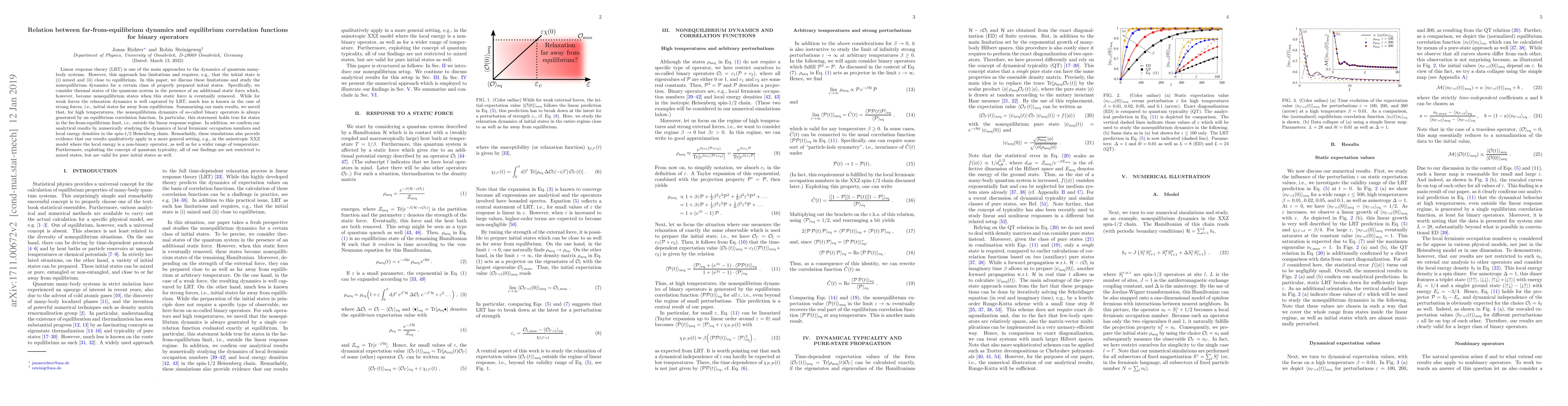 This paper explores the dynamics of quantum many-body systems under nonequilibrium conditions, revealing that the nonequilibrium dynamics of binary operators is governed by equilibrium correlation functions, even for states far from equilibrium. Numerical simulations in the spin-1/2 Heisenberg chain and the anisotropic XXZ model support the findings, demonstrating their applicability beyond mixed states to pure initial states via quantum typicality.