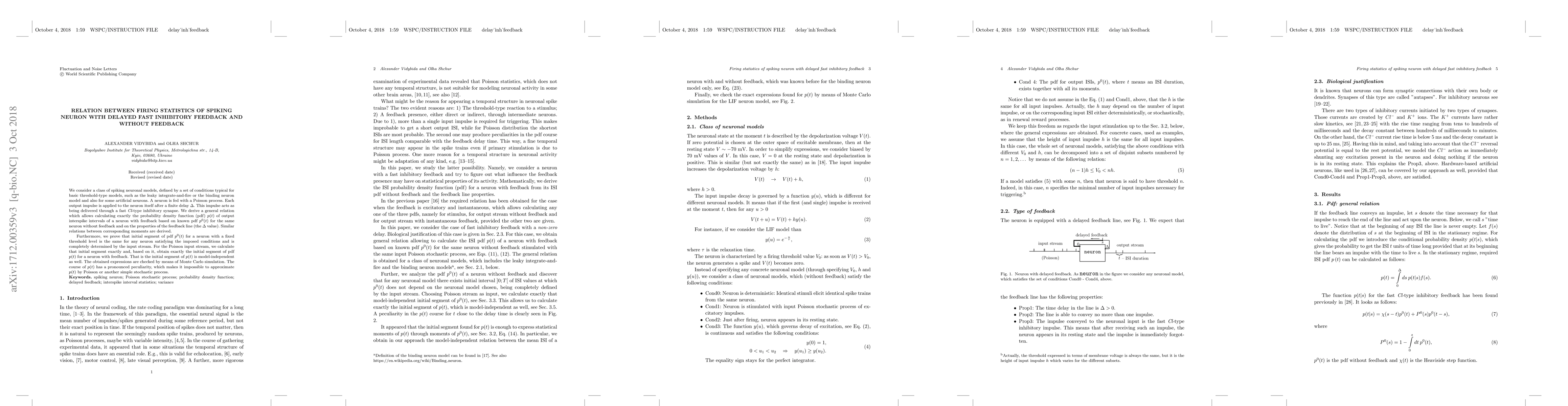 We consider a class of spiking neuronal models, defined by a set of conditions typical for basic threshold-type models, such as the leaky integrate-and-fire or the binding neuron model and also for some artificial neurons. A neuron is fed with a Poisson process. Each output impulse is applied to the neuron itself after a finite delay $\Delta$. This impulse acts as being delivered through a fast Cl-type inhibitory synapse. We derive a general relation which allows calculating exactly the probability density function (pdf) $p(t)$ of output interspike intervals of a neuron with feedback based on known pdf $p^0(t)$ for the same neuron without feedback and on the properties of the feedback line (the $\Delta$ value). Similar relations between corresponding moments are derived. Furthermore, we prove that initial segment of pdf $p^0(t)$ for a neuron with a fixed threshold level is the same for any neuron satisfying the imposed conditions and is completely determined by the input stream. For the Poisson input stream, we calculate that initial segment exactly and, based on it, obtain exactly the initial segment of pdf $p(t)$ for a neuron with feedback. That is the initial segment of $p(t)$ is model-independent as well. The obtained expressions are checked by means of Monte Carlo simulation. The course of $p(t)$ has a pronounced peculiarity, which makes it impossible to approximate $p(t)$ by Poisson or another simple stochastic process.