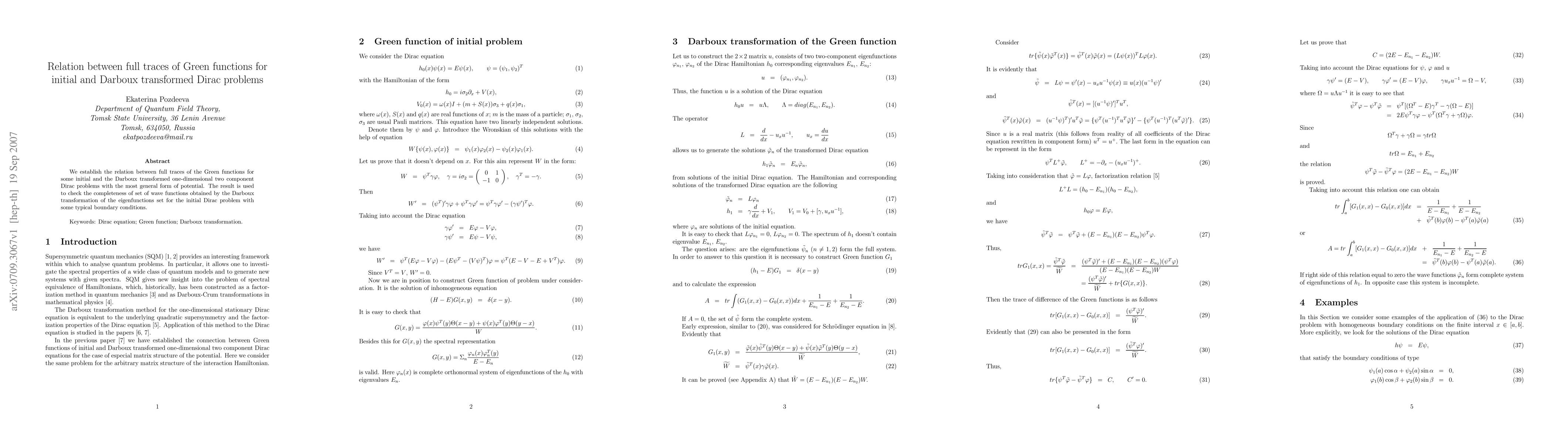 This paper establishes a connection between the full traces of Green functions for initial and Darboux transformed one-dimensional Dirac problems, using the most general potential form. The findings are applied to verify the completeness of wave functions derived from the Darboux transformation of the initial Dirac problem's eigenfunctions.