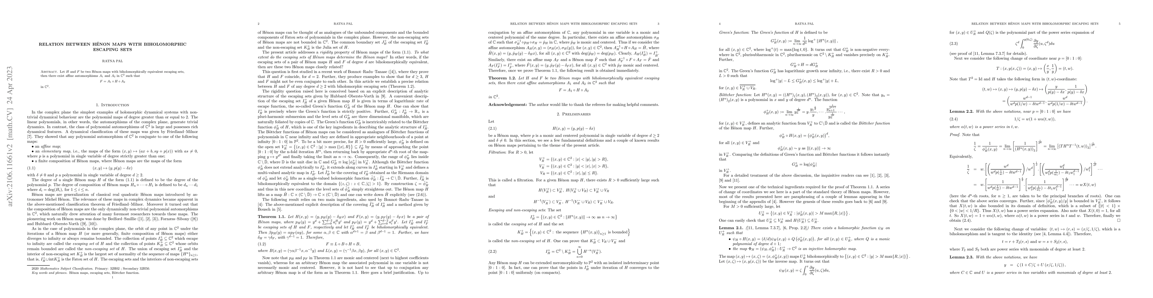 This paper investigates Hénon maps with biholomorphically equivalent escaping sets, proving that such maps can be related through affine automorphisms in $\mathbb{C}^2$ via the equation $F=A_1\circ H \circ A_2$.