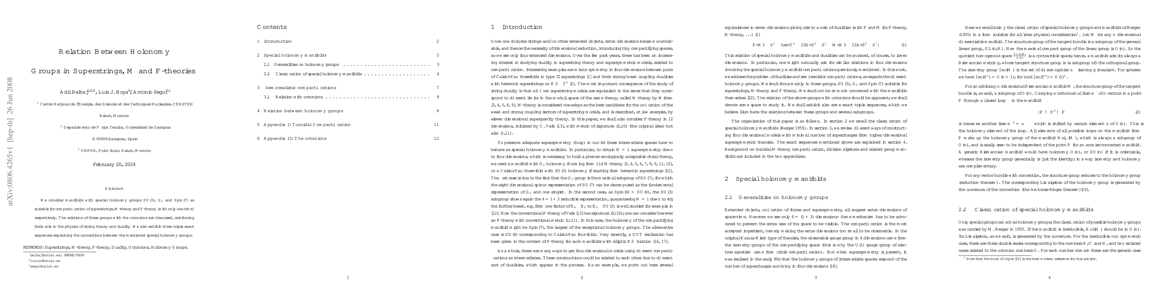 This paper explores the compactification of superstrings, M-theory, and F-theory on manifolds with holonomy groups SU(3), G2, and Spin(7), respectively, emphasizing their connections via the octonions and presenting three triple exact sequences to illustrate these relationships.