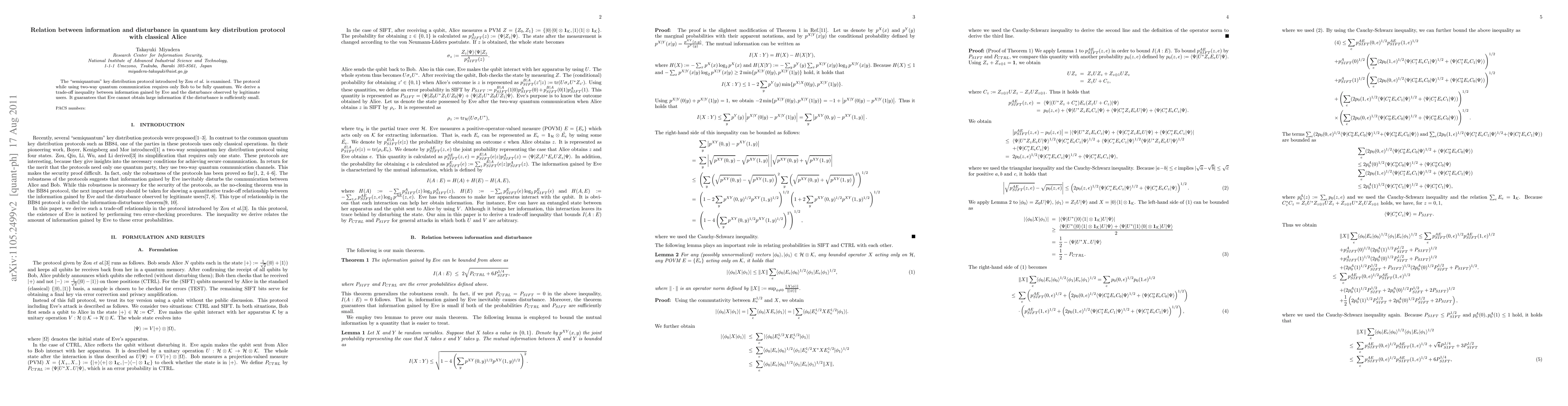 This paper examines the "semiquantum" key distribution protocol, where only Bob is quantum while Alice uses classical communication. It derives a trade-off inequality showing that Eve cannot gain significant information if the disturbance to legitimate users is minimal.