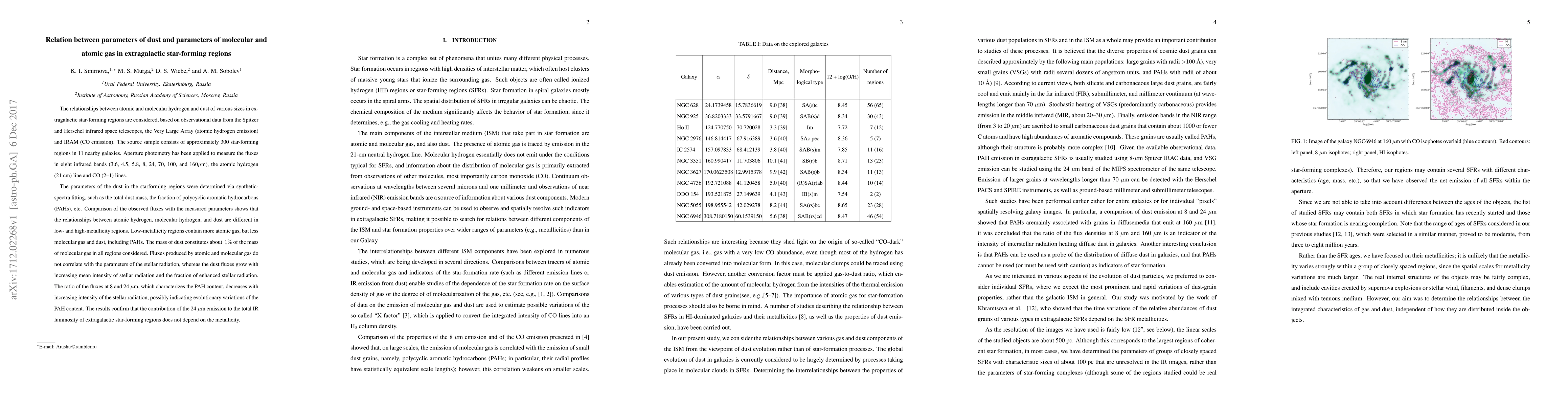 The relationships between atomic and molecular hydrogen and dust of various sizes in extragalactic star-forming regions are considered, based on observational data from the Spitzer and Herschel infrared space telescopes, the Very Large Array (atomic hydrogen emission) and IRAM (CO emission). The source sample consists of approximately 300 star-forming regions in 11 nearby galaxies. Aperture photometry has been applied to measure the fluxes in eight infrared bands (3.6, 4.5, 5.8, 8, 24, 70, 100, and 160$\mu$m), the atomic hydrogen (21cm) line and CO (2--1) lines. The parameters of the dust in the starforming regions were determined via synthetic-spectra fitting, such as the total dust mass, the fraction of polycyclic aromatic hydrocarbons (PAHs), etc. Comparison of the observed fluxes with the measured parameters shows that the relationships between atomic hydrogen, molecular hydrogen, and dust are different in low- and high-metallicity regions. Low-metallicity regions contain more atomic gas, but less molecular gas and dust, including PAHs. The mass of dust constitutes about $1\%$ of the mass of molecular gas in all regions considered. Fluxes produced by atomic and molecular gas do not correlate with the parameters of the stellar radiation, whereas the dust fluxes grow with increasing mean intensity of stellar radiation and the fraction of enhanced stellar radiation. The ratio of the fluxes at 8 and 24$\mu$m, which characterizes the PAH content, decreases with increasing intensity of the stellar radiation, possibly indicating evolutionary variations of the PAH content. The results confirm that the contribution of the 24$\mu$m emission to the total IR luminosity of extragalactic star-forming regions does not depend on the metallicity.