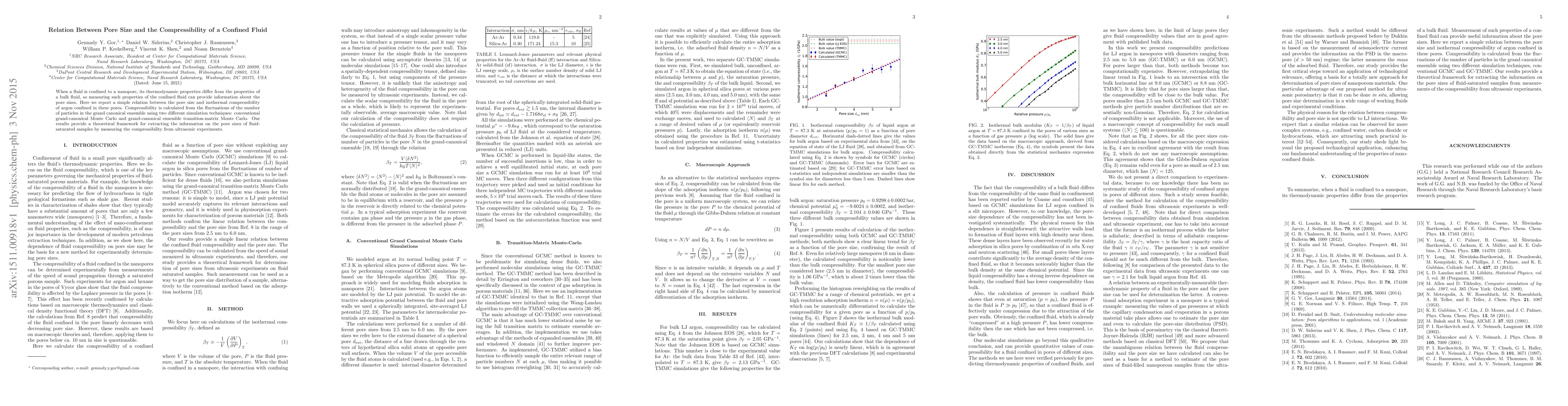 This paper establishes a relationship between pore size and the isothermal compressibility of argon confined in nanopores, using two simulation techniques to calculate compressibility. The findings offer a theoretical basis for determining pore sizes in fluid-saturated samples via compressibility measurements from ultrasonic experiments.