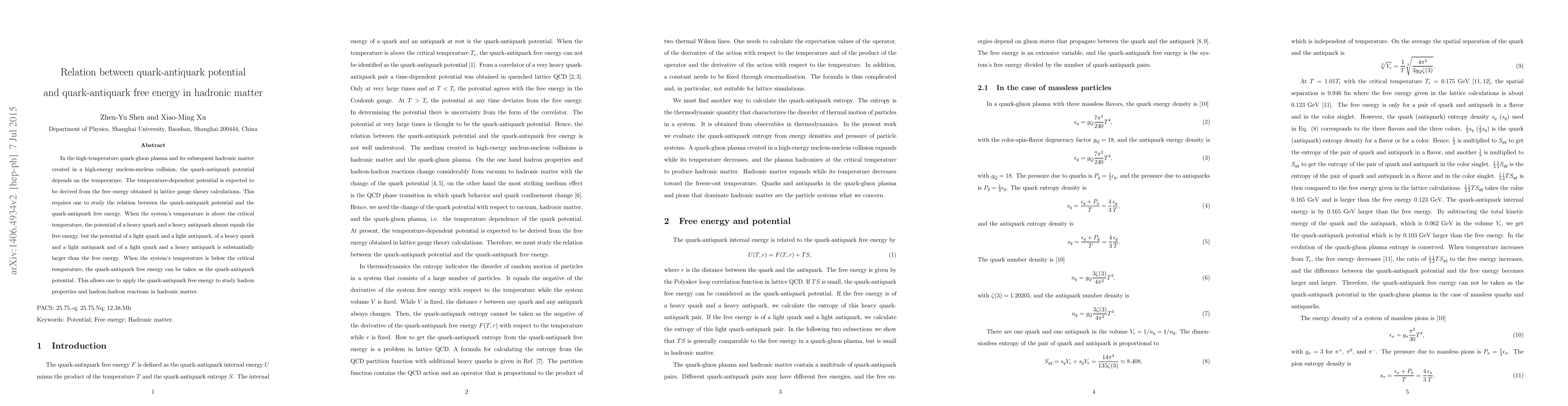 The paper presents a detailed analysis of the quark-antiquark potential and free energy relationship in hadronic matter, extending previous work to include massive quarks and providing a comprehensive comparison between massless and massive cases.