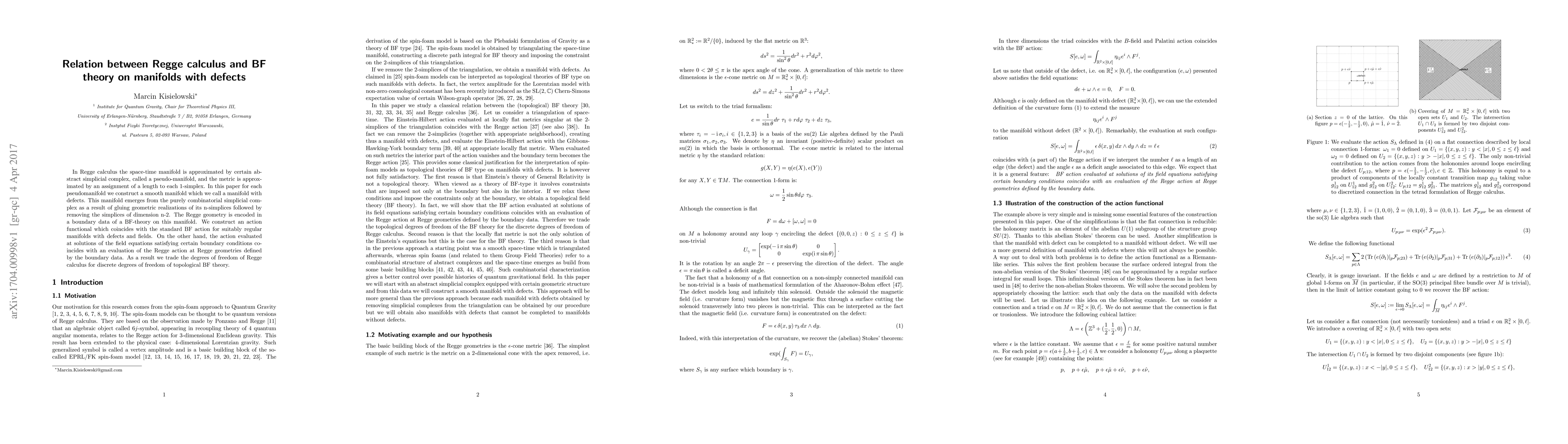 This paper constructs a smooth manifold with defects from a combinatorial simplicial complex used in Regge calculus and shows that Regge geometry can be encoded in the boundary data of BF theory. The proposed action functional aligns Regge calculus with BF theory, exchanging continuous Regge degrees of freedom for discrete topological degrees.