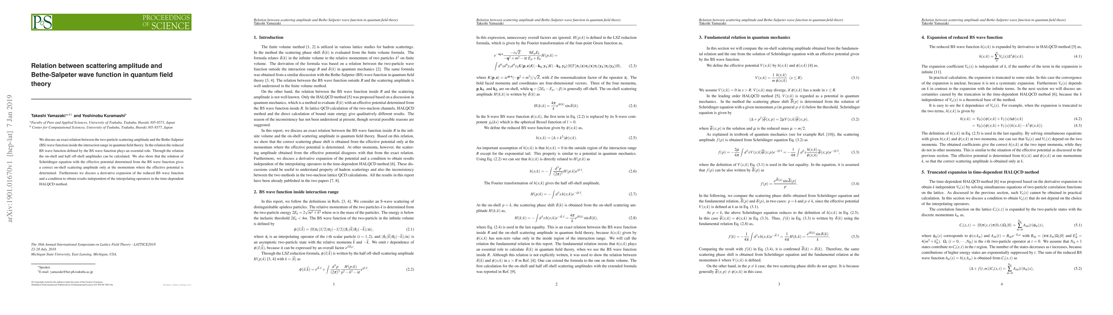We discuss an exact relation between the two-particle scattering amplitude and the Bethe-Salpeter (BS) wave function inside the interaction range in quantum field theory. In the relation the reduced BS wave function defined by the BS wave function plays an essential role. Through the relation the on-shell and half off-shell amplitudes can be calculated. We also show that the solution of Schr\"odinger equation with the effective potential determined from the BS wave function gives a correct on-shell scattering amplitude only at the momentum where the effective potential is determined. Furthermore we discuss a derivative expansion of the reduced BS wave function and a condition to obtain results independent of the interpolating operators in the time-dependent HALQCD method.