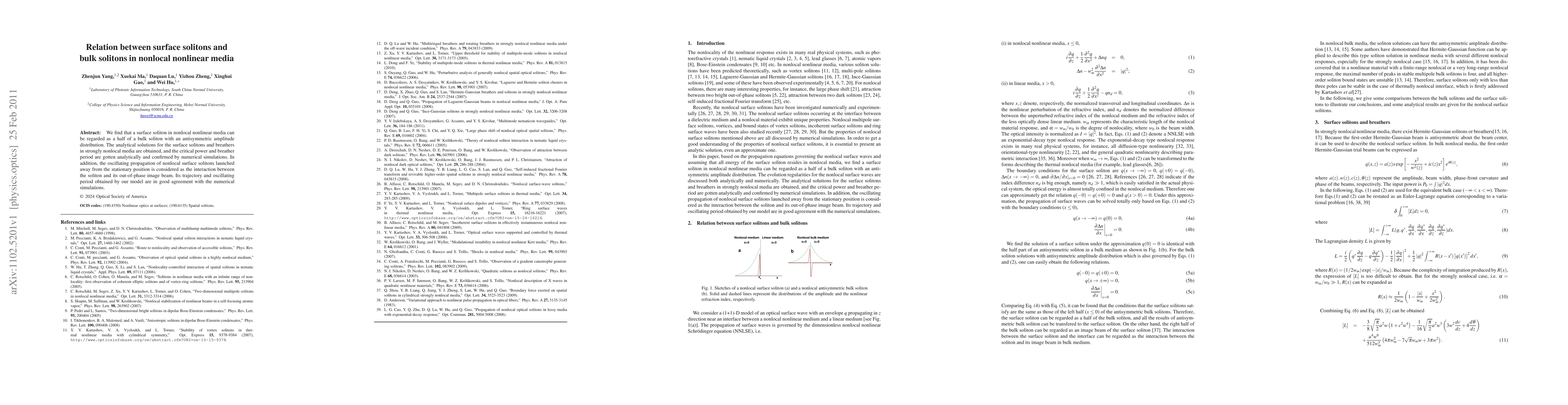 This paper explores the relationship between surface solitons and bulk solitons in nonlocal nonlinear media, demonstrating that surface solitons can be seen as half of a bulk soliton with an antisymmetric amplitude distribution. Analytical solutions and critical power thresholds for surface solitons and breathers are derived and validated through numerical simulations.