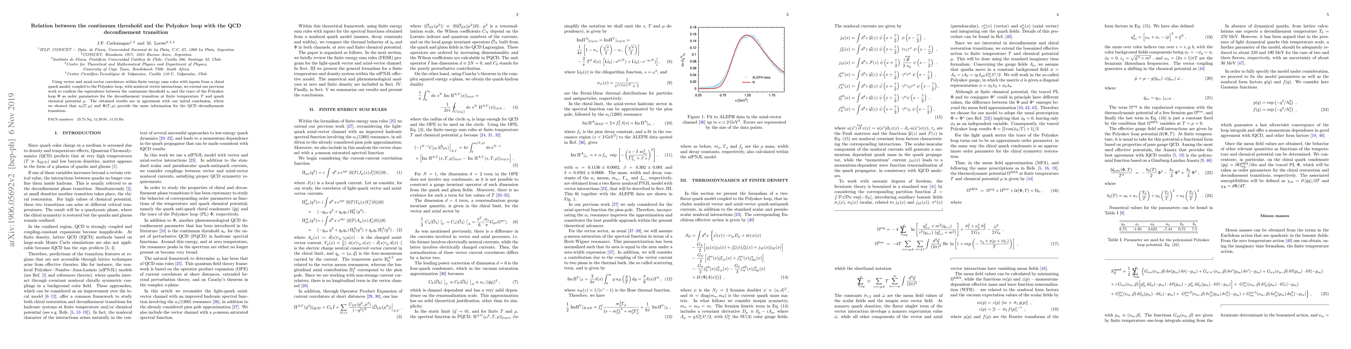 This paper confirms the equivalence between the continuum threshold $s_0$ and the trace of the Polyakov loop $\Phi$ as order parameters for the QCD deconfinement transition at finite temperature and chemical potential, using vector and axial-vector correlators within finite energy sum rules. The results align with previous findings, indicating both $s_0$ and $\Phi$ provide the same information for this transition.
